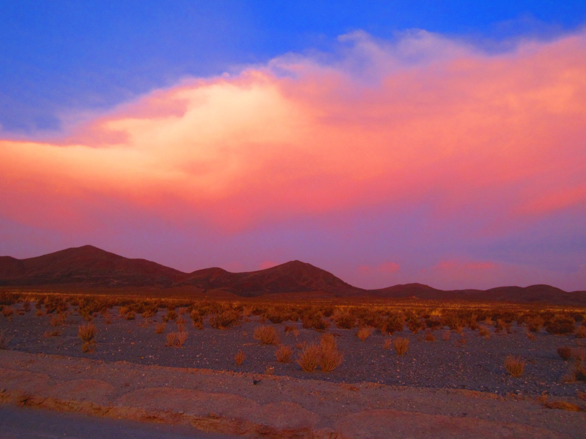 De là, l’idée était de reprendre une piste en direction de San Antonio de las Cobres. Nous tâtonnons un peu, effectuons sans rien trouver une quarantaine de km, décidons de revenir sur nos pas pour prendre une piste plus sûre (c’est-à-dire, dont on est certains qu’elle existe). Le jour baisse et nous souhaiterions arriver avant la nuit. En nous engageant sur la piste, nous évaluons la distance à parcourir à une quarantaine de kilomètres, grand maximum. Le chemin en tôle ondulée est interminable. Après 50 km parcourus, un premier panneau nous indique le village de San Antonio à 60 km. Le plan de la région n’est absolument pas à l’échelle ! En attendant, nous traversons des paysages désertiques magnifiques, peuplés de renards et d’ânes en totale liberté. Superbe coucher de soleil sur les montagnes au loin.