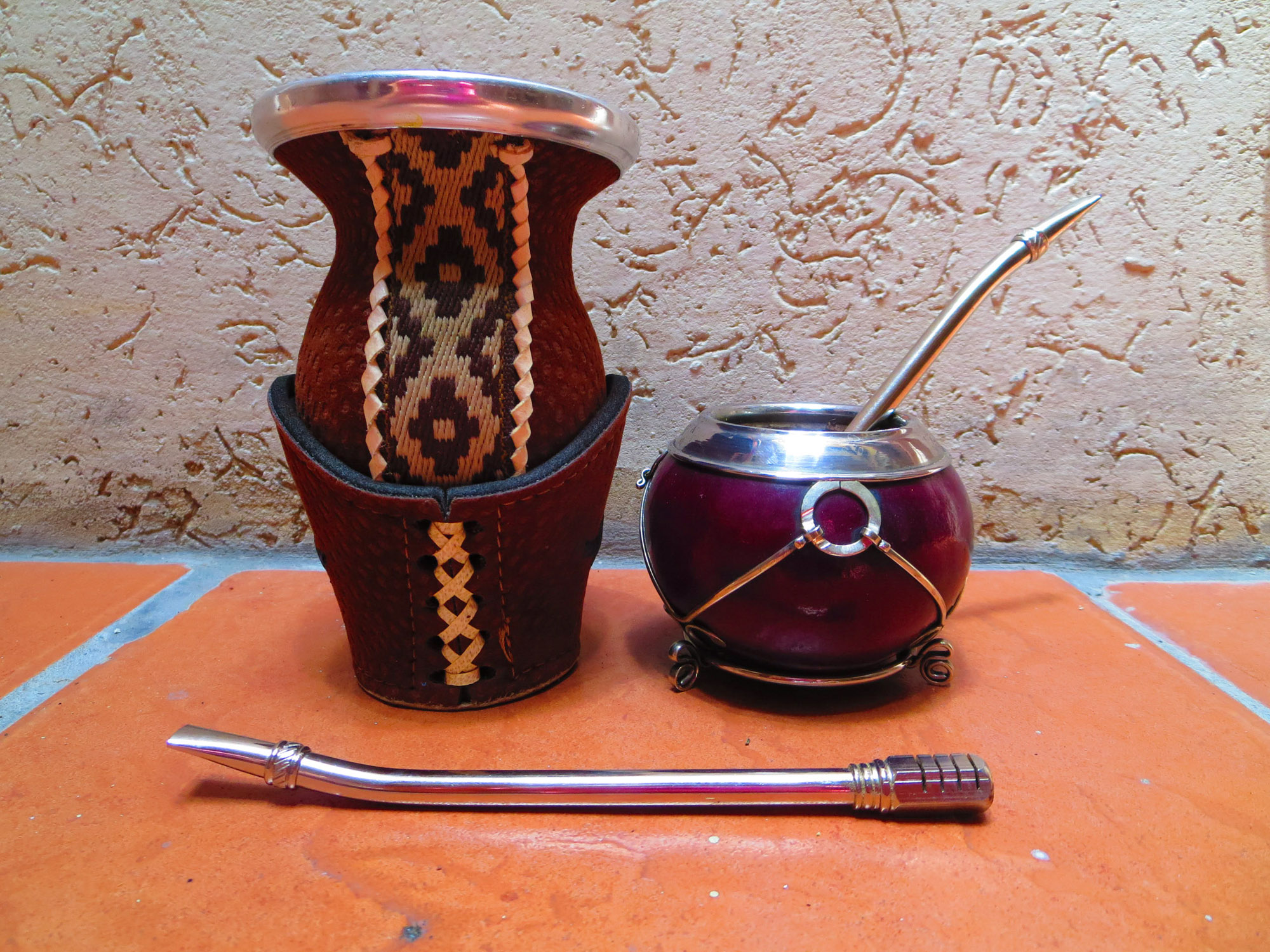Le maté se boit traditionnellement dans une calebasse (une courge évidée, séchée et teinte), dont on a serti l’ouverture avec une bande métallique. Avec le temps, le design des calebasses a évolué: on en trouve en métal, sculptées dans du bois, en céramique, ou comble du kitch, creusé dans un sabot de vache…