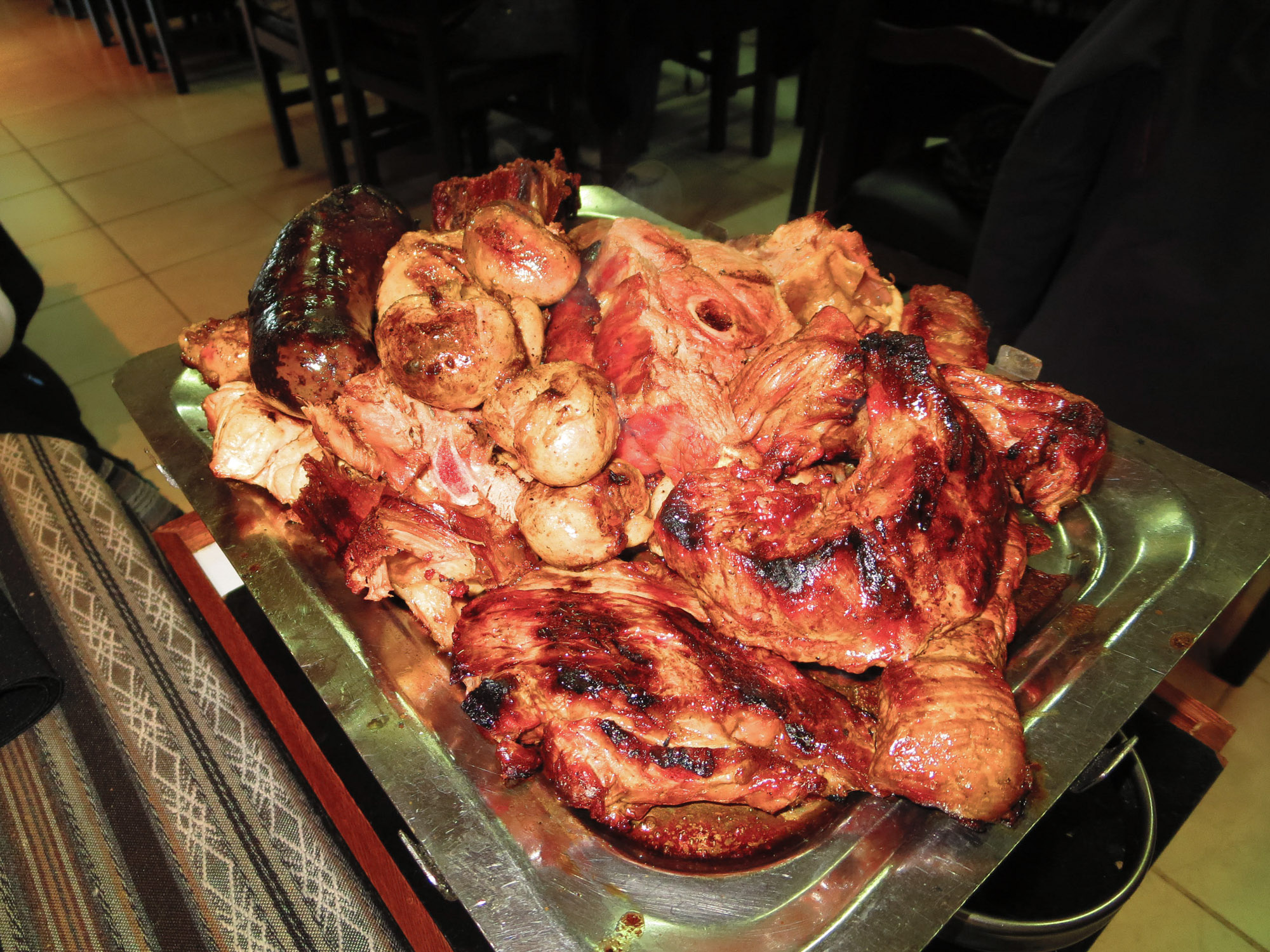 Et il n’y a pas que du boeuf. On élève aussi du mouton en Patagonie, ainsi que des porcs, des poulets dans le reste du pays… Le tout est regroupé dans un plat constituant le combo gagnant: la parilla. Un assortiment monstrueux de viandes grillées, servi en table avec son chauffe-plat personnel. La montagne de viande comprend côtelettes, rognons, boudins, échine, tripes… Rien qu’en regardant la photo, on se sent serré dans le jean. Ca a été notre repas de Noel. Et on a nettoyé le plateaux à trois. On était juste très contents que Michelle, la mère de Nicolas, ait apporté du citrate de bétaine dans ses valises.