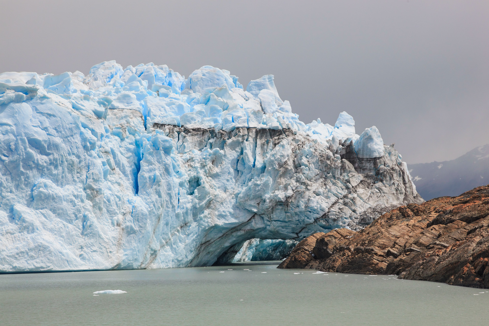 En butant sur la roche, le glacier bloque l’écoulement de la rivière et crée un barrage entre les deux lacs. Avec le temps et l’élévation du niveau de l’eau, la pression monte et finit par faire éclater le barrage dans un fracas cataclysmique. Ca s’appelle la rupture. Ce phénomène a lieu à peu près tous les 4 ans. Il s’est produit deux jours avant notre visite. Au niveau du barrage de glace, il y a désormais une énorme arche qui se désagrège lentement et des flots furieux qui, sur le principe des vases communiquant, s’empressent de rétablir un niveau égal entre les lacs.