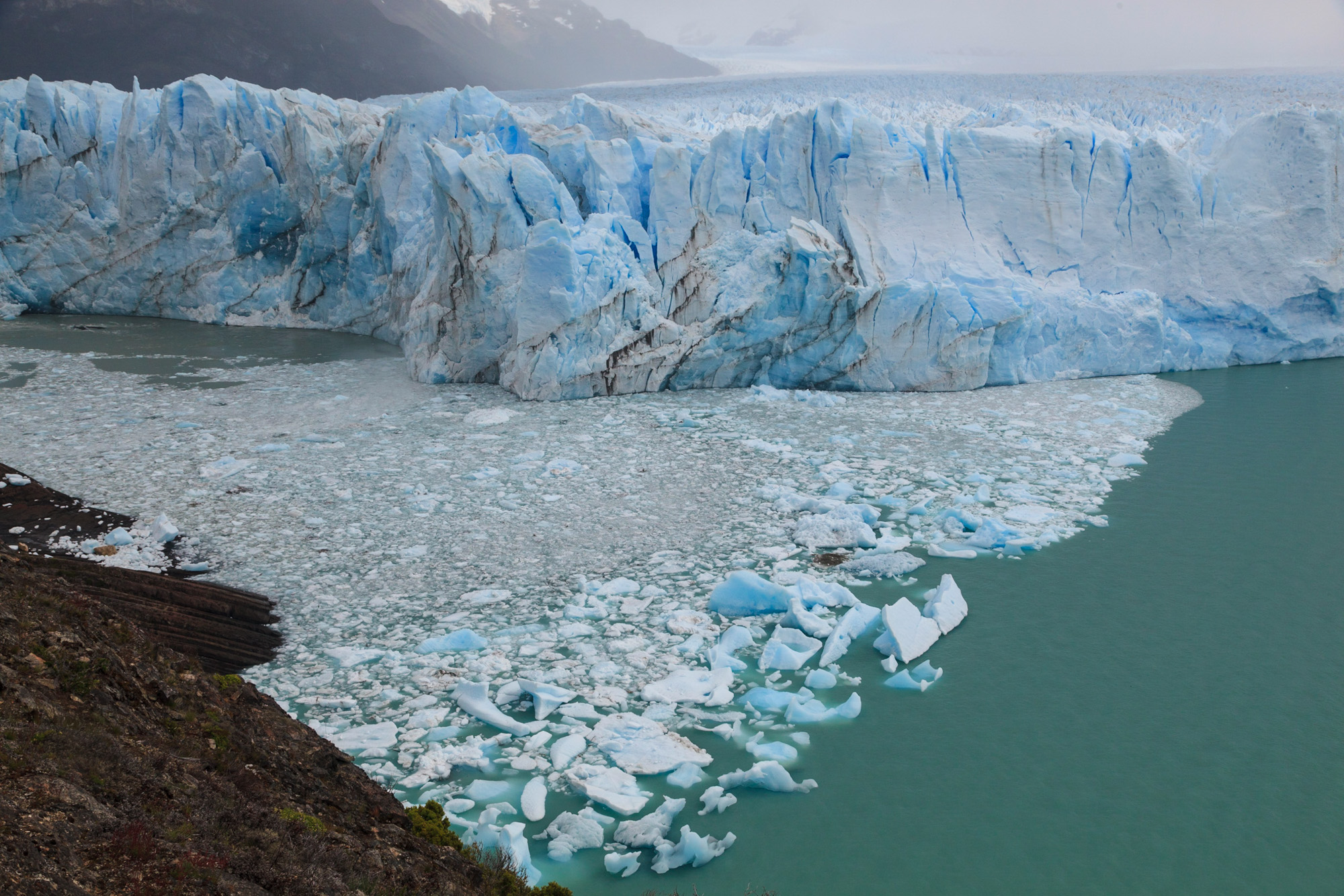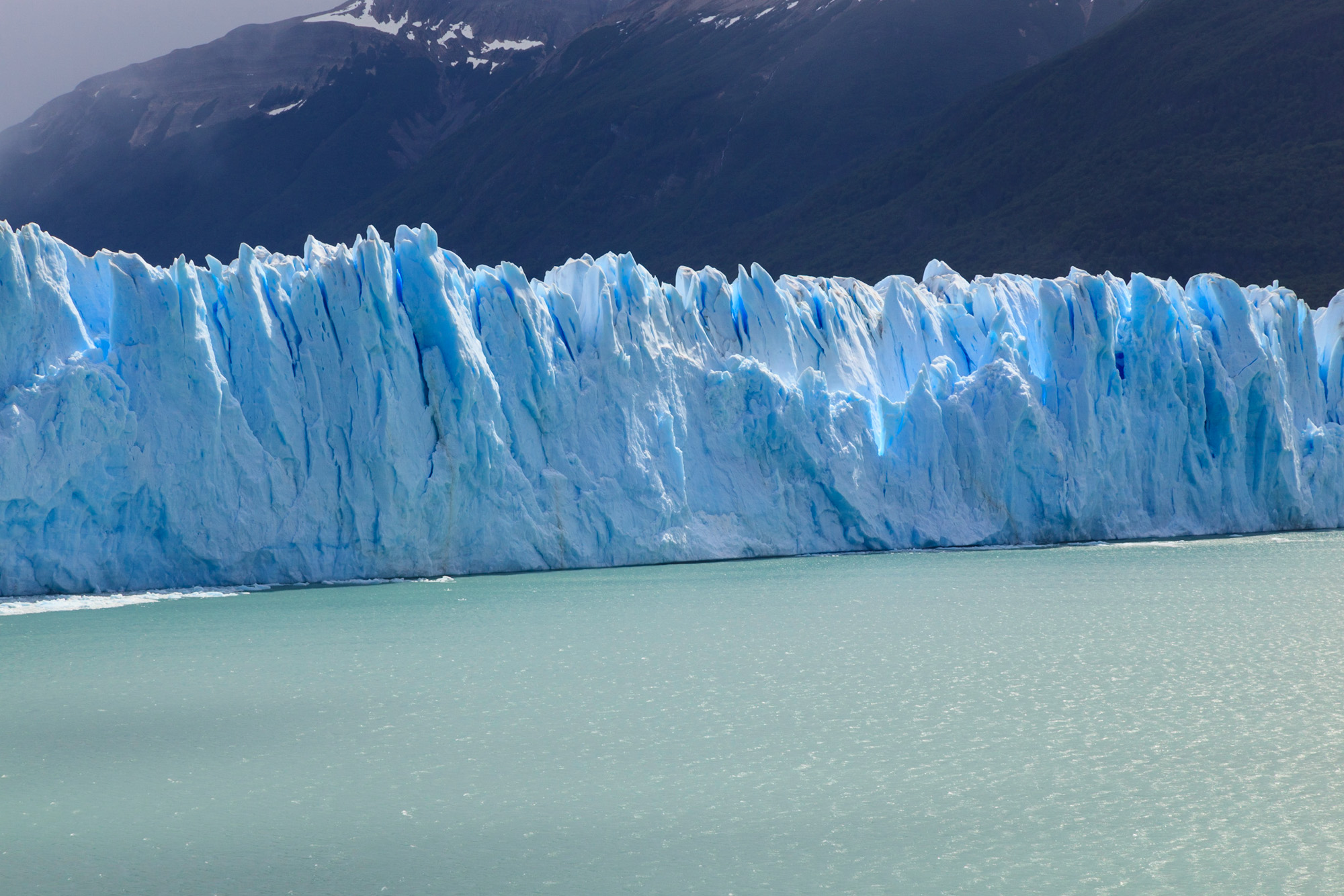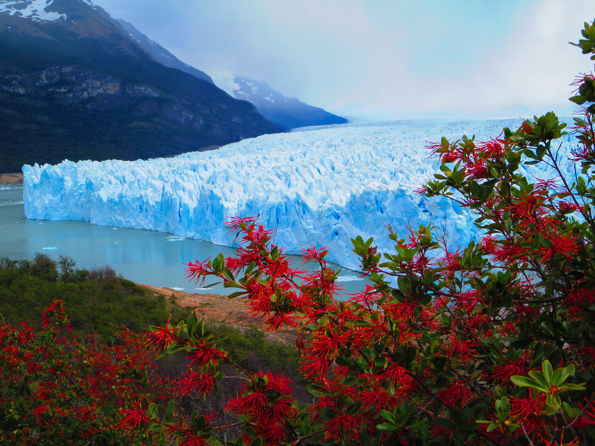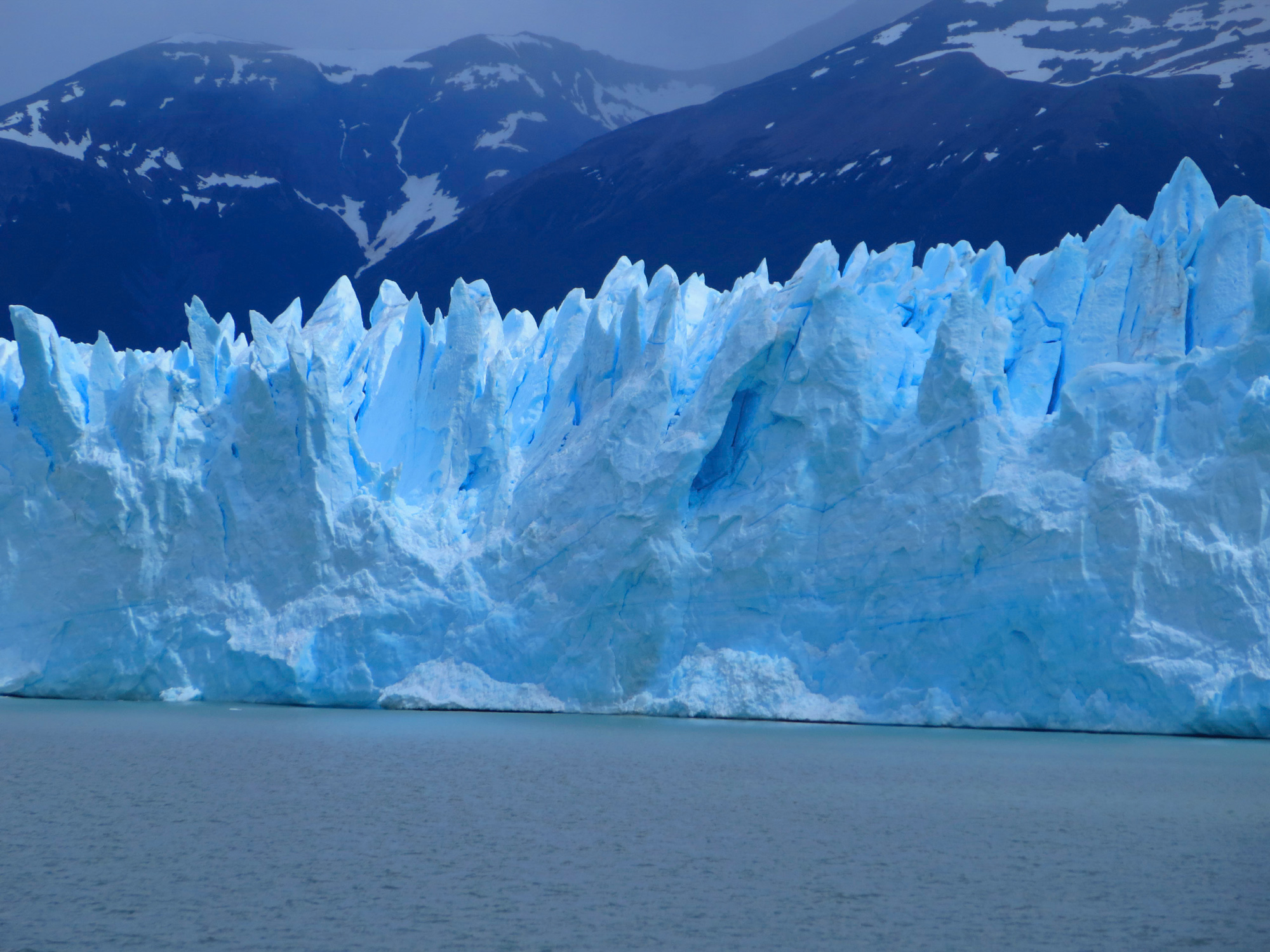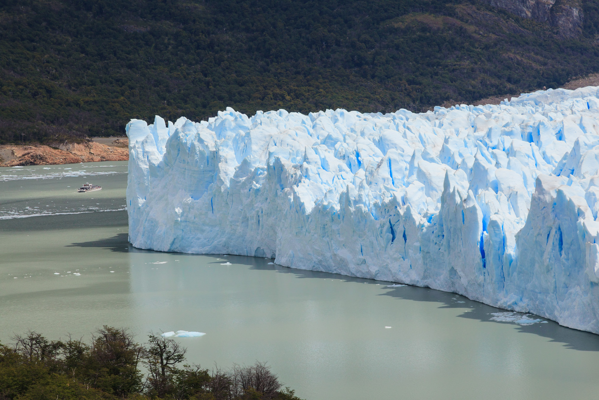 Non, ce n’est pas le nouveau concurrent de Bertillon ou Haagen Daas. Il s’agit du plus spectaculaire des glaciers andins: 15km de long sur 5km de large. Il atteint 60m au dessus du niveau du lac et couvre une superficie équivalente à la ville de Buenos Aires. Il est une des terminaisons du Hielos Continentales, une immense plate-forme glacée de 500km de long à cheval entre l’Argentine et le Chili. La glace descend lentement jusqu’au lac en sculptant les vallées et les pics acérés des montagnes. De fait, les morceaux que nous voyons aujourd’hui se détacher de la paroi de glace se sont formés il y a plus de 15.000 ans. Un véritable cours d’histoire-géo.