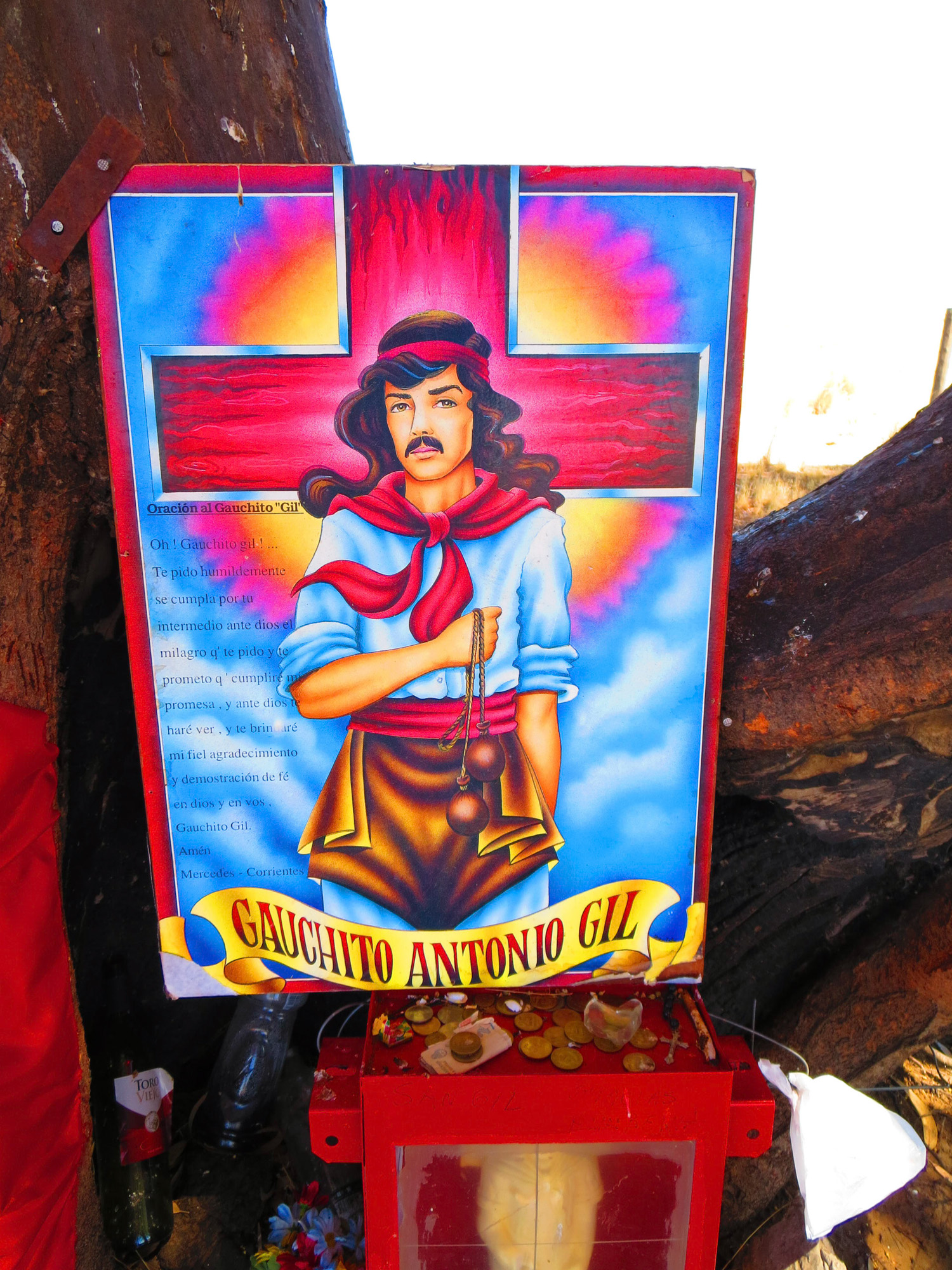 On les reconnait aux petites cahutes rouges sur le bas-côté ou les aires de repos. Gauchito Gil, c’est un peu le Robin des Bois argentin. On dit aussi qu’il aurait accompli des miracles. Du coup, les Argentins lui font des offrandes…toujours rouges. Écharpes rouges, fleurs pourpres, bougies carmins et…bouteilles de vin rouge. En Patagonie, on trouvait aussi des bouteilles d’eau à côté des maisonnettes rouges en mémoire d’une femme qui en cherchant son mari parti en guerre se serait perdu dans les grands espaces patagons et serait morte de soif.