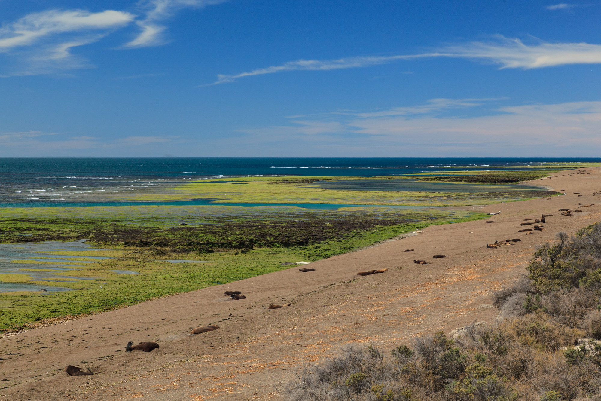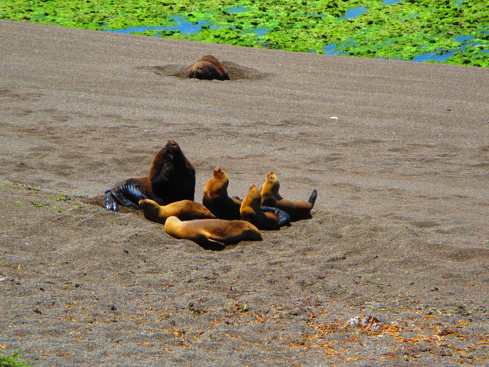 Le lendemain, nous tentons notre bonne fortune en mettant le cap sur la Punta Norte, repère de lions de mer et d’éléphants de mer. Cette fois-ci la chance tourne: les animaux sont au rendez-vous. On les observe du promontoire. Ils sont affalés sur la plage, seuls ou en groupe. Les lions de mer sont reconnaissable à la fourrure rousse qu’ils portent autour du cou telle une crinière. Les mâles dorment au milieu de leur harem. Les éléphants de mer, reconnaissables à leur trompe, se provoquent dans des joutes, ou dorment en émettant des grognements de bien-être. Longtemps chassés pour leur peau, leur viande et leur graisse, ils sont aujourd’hui protégés et ne font aucunement attention à nous.