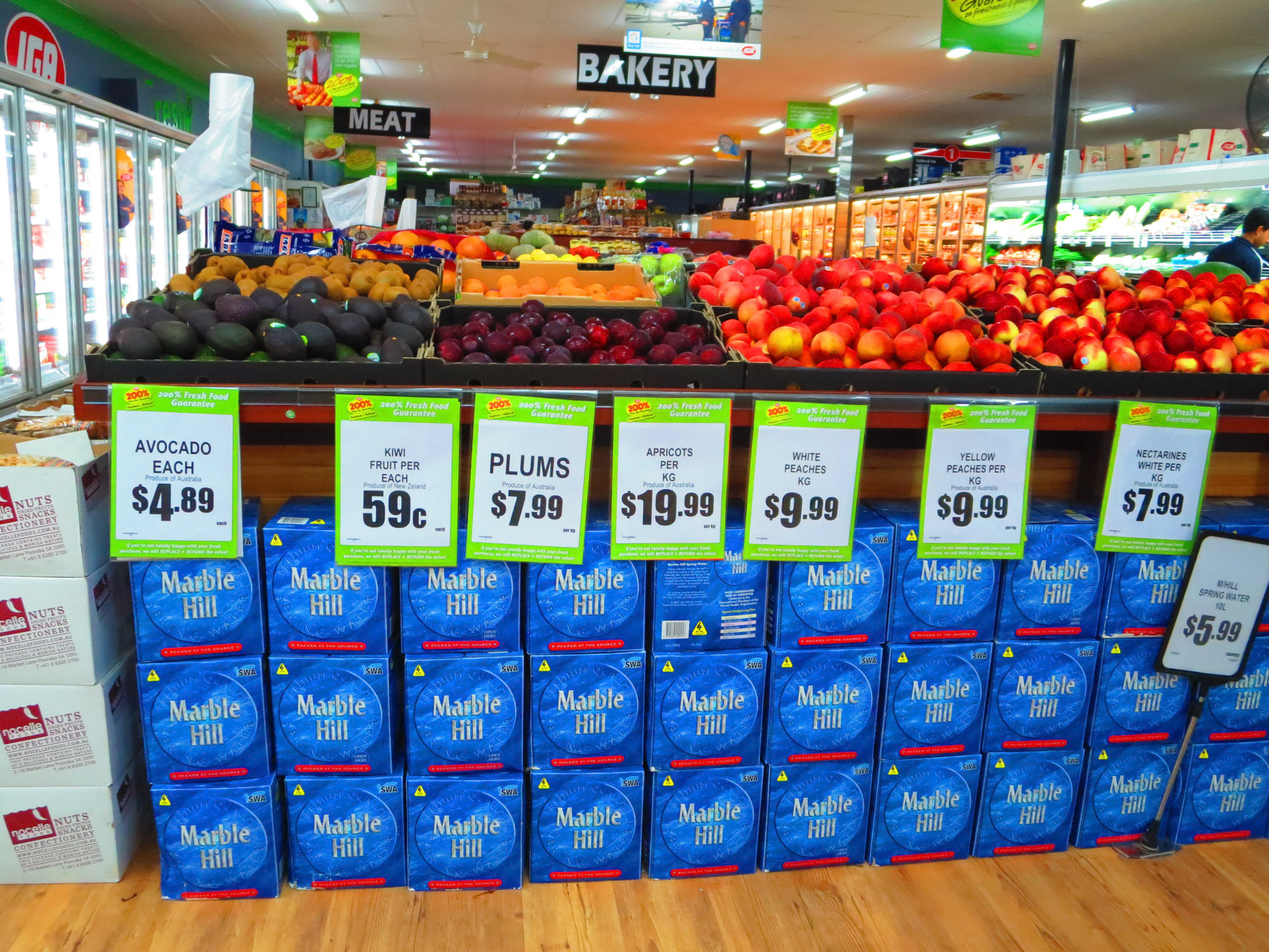 “L’Australie, le pays de la vie plus chère“. Quand on va au supermarché, on se croirait chez Hédiard ou Fauchon… mais juste pour le niveau prix. Quelques exemples: le kilo de tomates à 6€, les 800 gr de Yaourt à 4,5€, l’avocat à 3€, le concombre à 2€. On a même vu un kilo d’abricots à 15€.