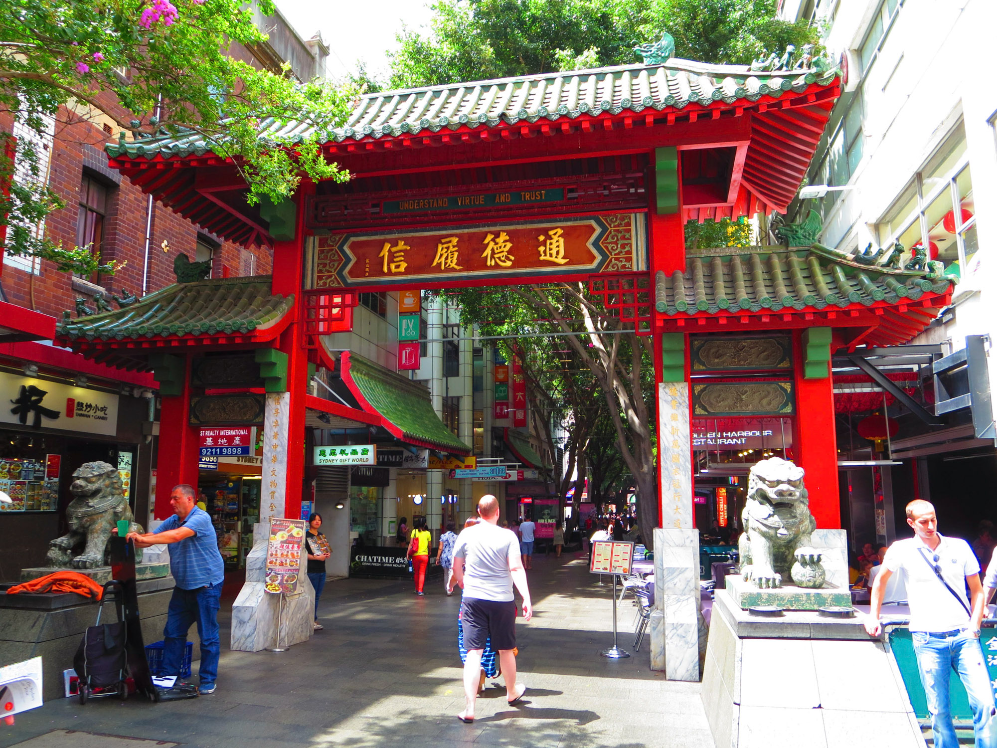 On traverse une rue et hop, on se retrouve dans un autre monde. Lampions, pagodes, enseignes en chinois. C’est un point commun avec les USA, les Chinatowns. Toutes les grosses villes australiennes comportent un quartier où les immigrants chinois se sont reconstitué un petit Pékin, un Shanghai réduit, un Canton miniature. Dans les magasins, on trouve des bijoux en jade, des herbes et des racines en bocaux avec des étiquettes rédigées en chinois (et jamais traduites), des Maneki Neko (le fameux chat porte-bonheur qui agite la patte gauche dans les vitrines), et les menus des restaurants affichent des beignets au crabe et des bouchées à la vapeur…