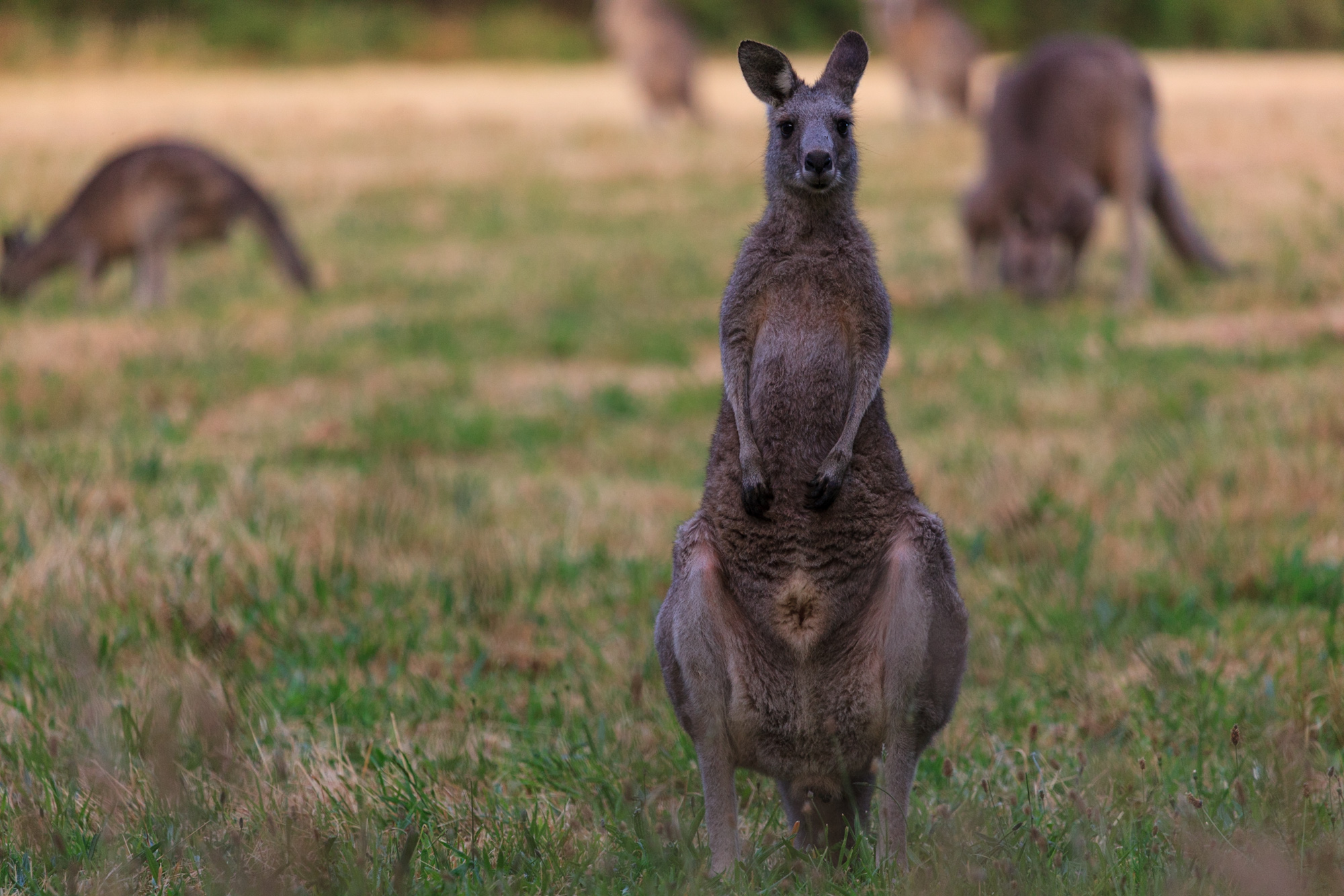 En chemin pour le camping, nous longeons des champs envahis par des dizaines de kangourous. Nos premiers spécimens sauvages !