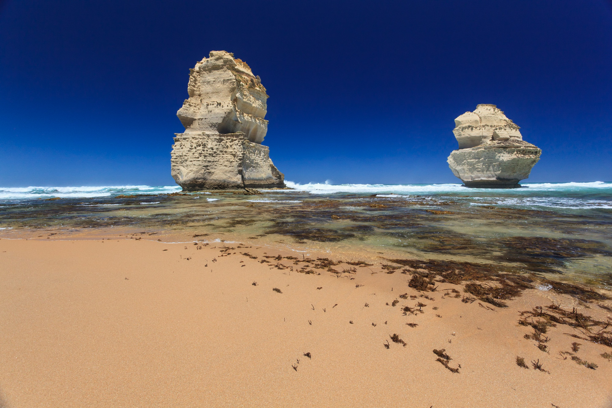 Nous laissons les koalas à leurs siestes sans fin pour continuer notre route. La Great Ocean Road nous réserve encore de très belles surprises. Le clou du spectacle, ce sont les formations appelées “Douze Apôtres“: des aiguilles de calcaire séparées de la falaise par l’érosion.