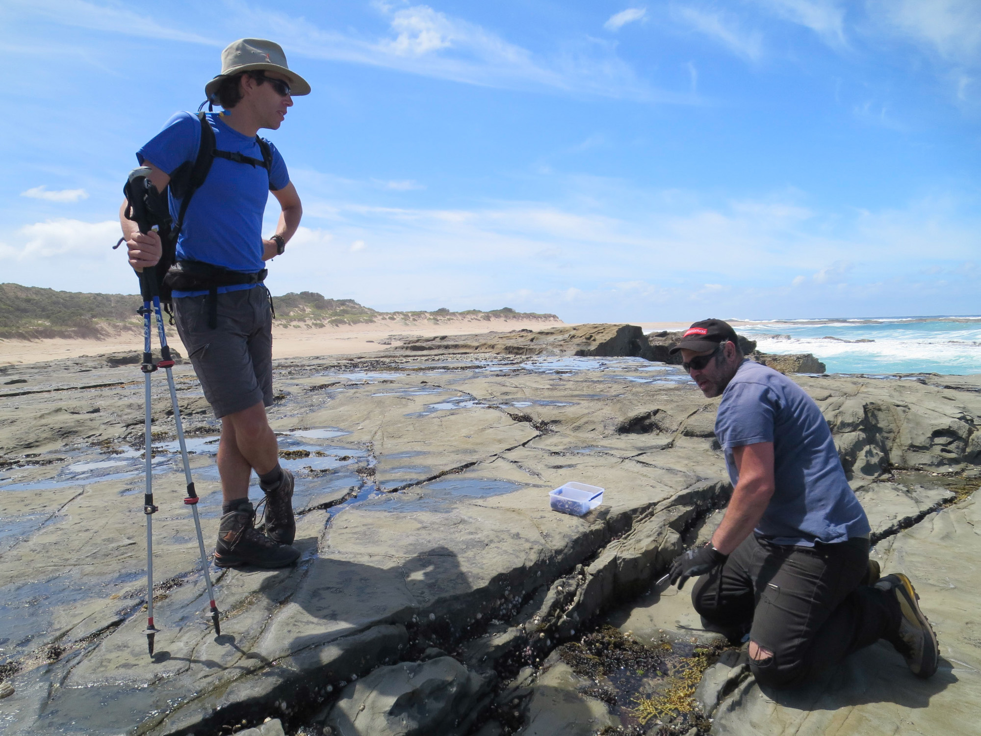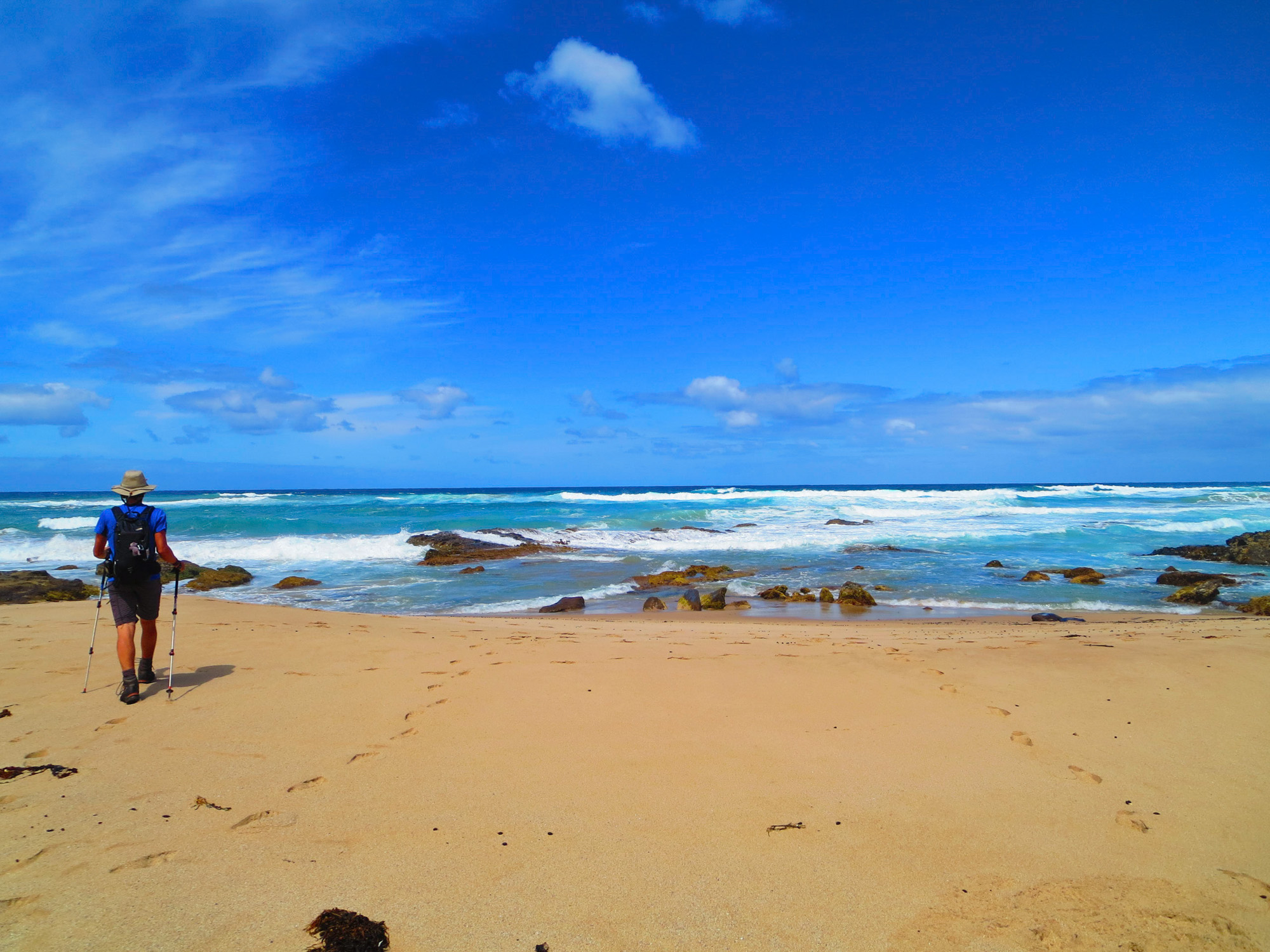 Nous descendons sur une plage où s’activent des pêcheurs et des ramasseurs de crustacés. Nous engageons la conversation avec un pêcheur qui fouille dans un trou d’eau armé d’une pince et de gants. Il ramasse des moules. Il nous explique que le plus gros danger ici, ce sont les pieuvres à anneaux bleus: c’est pas très gros, assez craintif mais un contact avec cette petite bête vous envoie en quelques minutes au cimetière. Le pêcheur nous raconte qu’on n’a absolument pas le temps de faire venir les secours. Le poison est fulgurant. D’où la nécessité de se protéger avec des gants. Il en a déjà vu une fois dans le coin. Pour la suite de la promenade, nous ferons (encore plus) attention où nous mettrons les pieds.