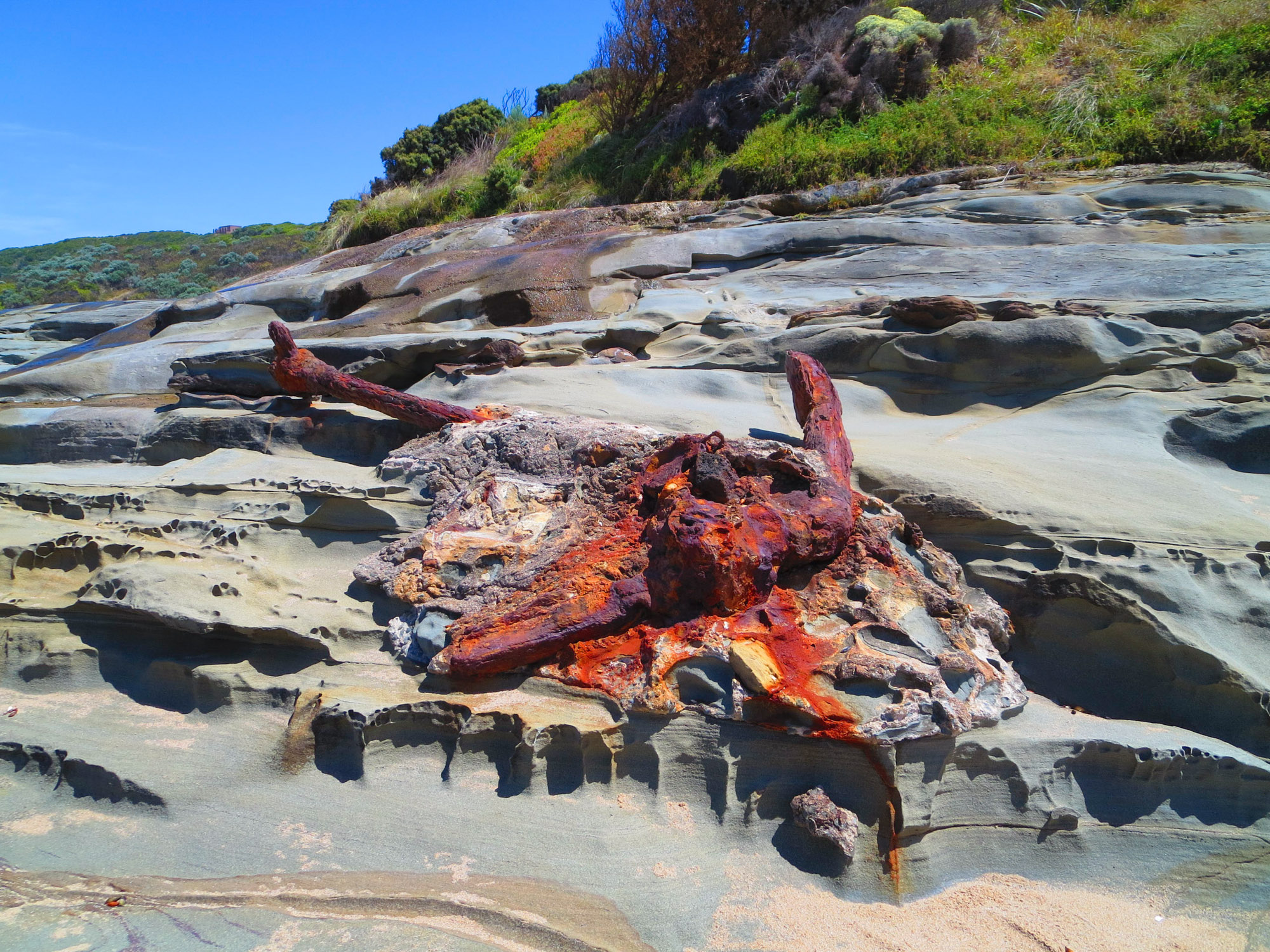 Avant de quitter la Great Ocean Road, nous passons aux gorges du Loch Ard. Un impressionnant canal creusé par l’érosion dans la falaise. Il a été témoin d’un naufrage particulièrement catastrophique en 1878. Le Loch Ard était un voilier qui achevait un voyage de trois mois. Il transportait 52 voyageurs et devait arriver le lendemain à destination. Le capitaine qui connaissait la très mauvaise réputation de la côte et qui était inquiet des mauvaises conditions météorologiques veilla toute la nuit sur le pont du bateau. A 4h00 du matin, dans un brouillard à couper au couteau, il aperçut à quelque mètres la falaise sur laquelle son bateau devait se fracasser. Des courants traitres l’avait insidieusement dérouté. Les flots démontés empêchèrent l’équipage de mettre les canots de sauvetage à l’eau. 50 personnes perdirent la vie. Un mousse et une jeune femme furent poussés par les courants dans la gorge. Le mousse sauva la jeune femme de la noyade. Aujourd’hui, les gorges se terminent en une plage fréquentée par les touristes. En regardant l’embouchure, attaquée par les flots furieux, on a une pensée pour les gens qui se sont débattus.
