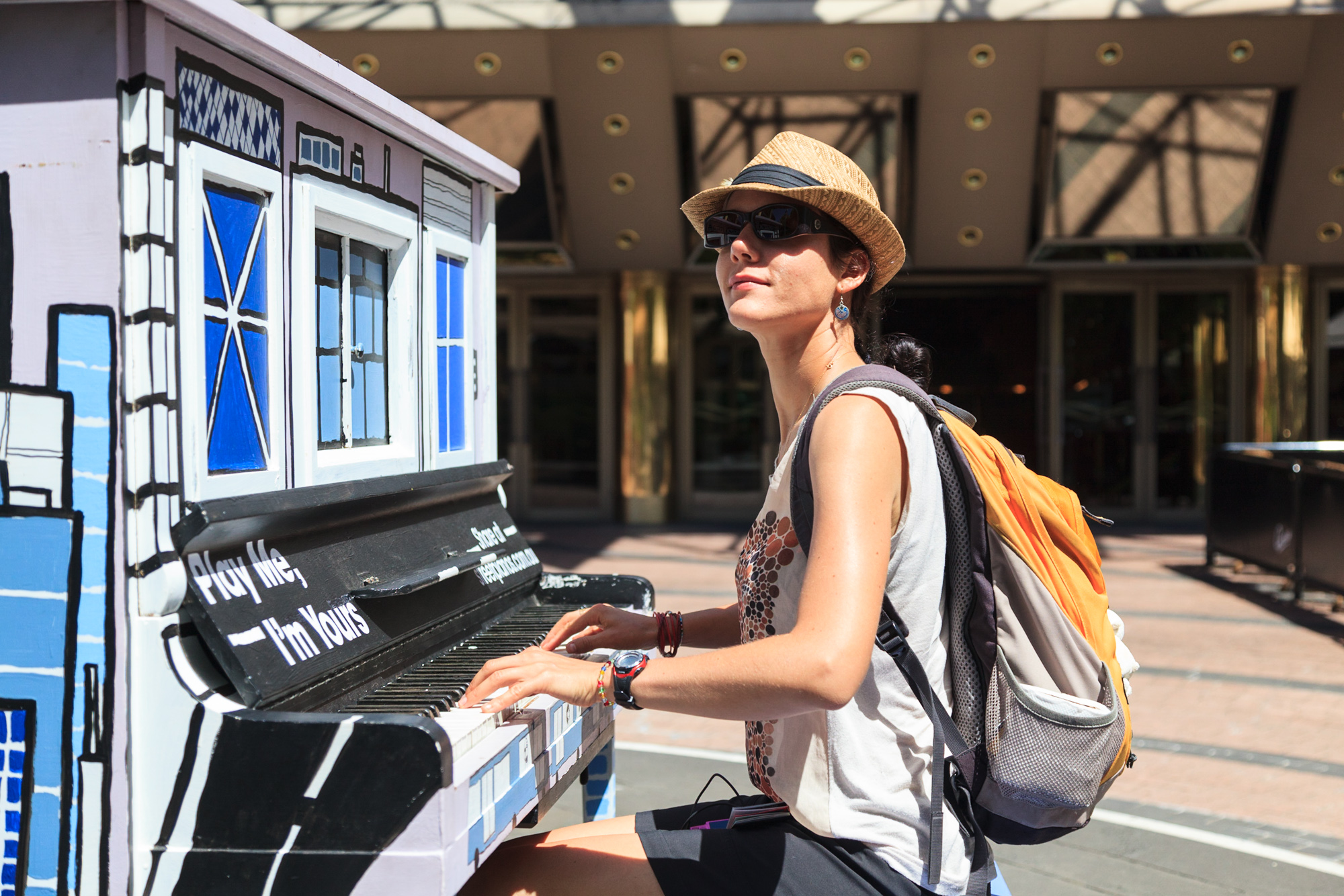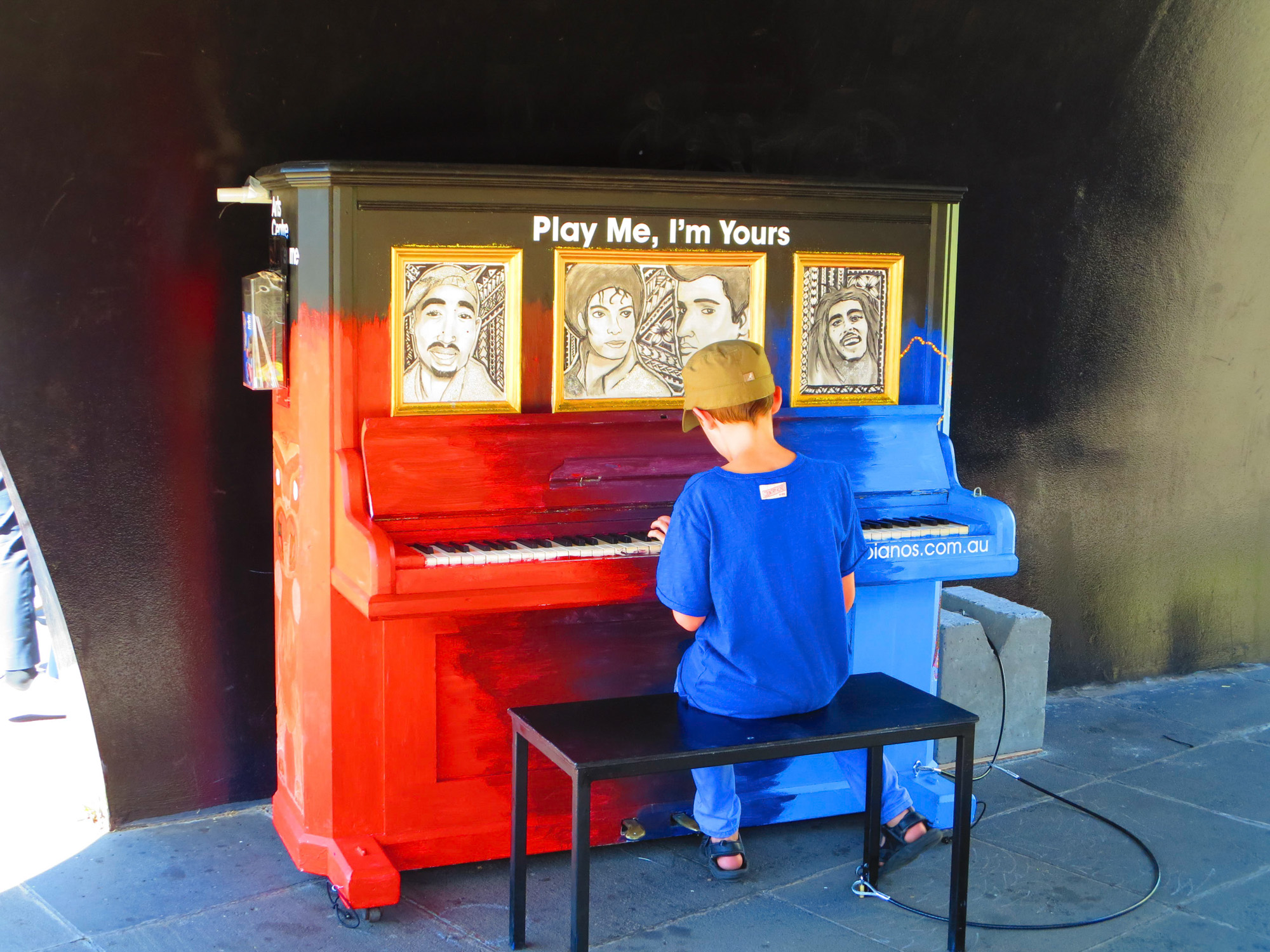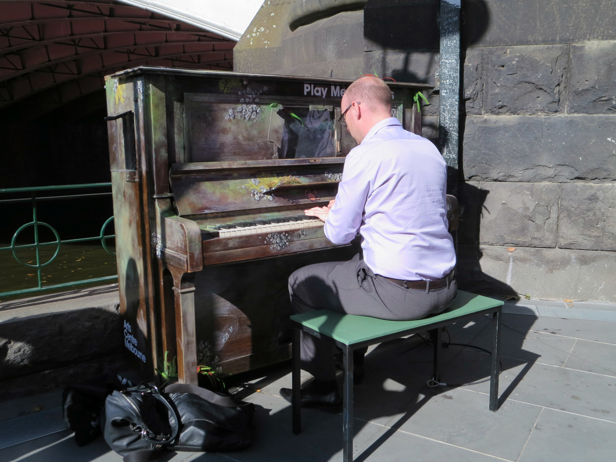 Mais l’idée que nous avons trouvée la plus intéressante, c’est celle des pianos abandonnés aux quatre coins du centre-ville. Sur un pont, sur les quais de la rivière qui traverse la cité, abrité sous un porche, devant l’entrée d’une galerie commerciale, des pianos peinturlurés attendent qu’on vienne jouer quelques notes. D’ailleurs, ils aguichent les passants avec leur inscription “Play Me, I’m Yours”. “So I won’t hesitate, no more, no more, I cannot wait… ”: Moi, j’ai joué J’ai du bon tabac, seule relique de mes 7 ans de cours de piano…