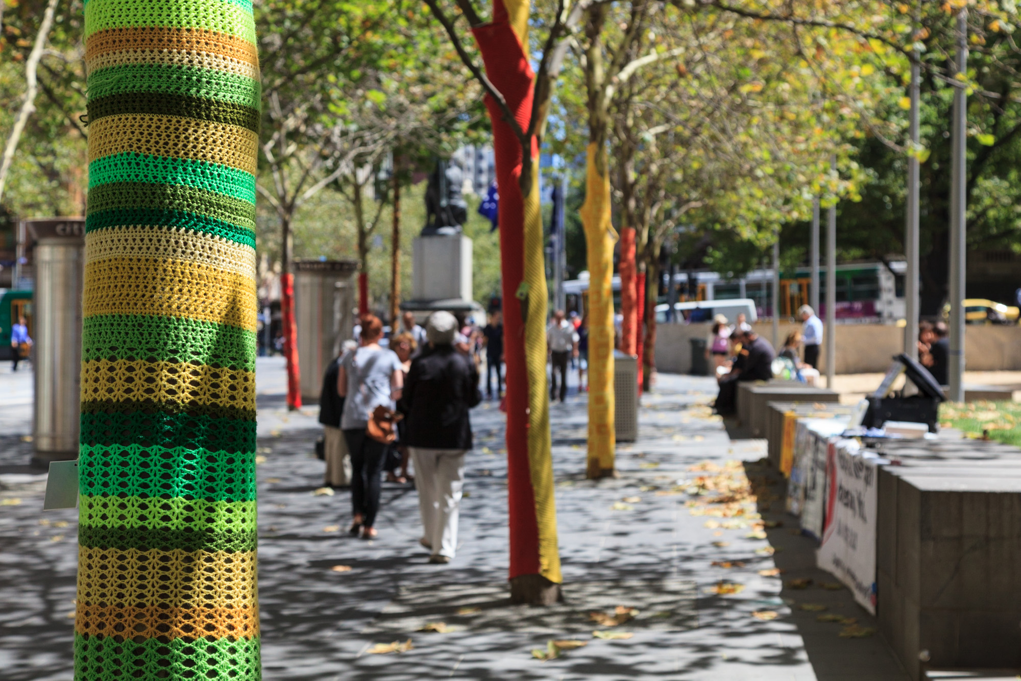 Dans une des artères principales, les troncs d’arbre portent des chandails de laine confectionnés au crochet.