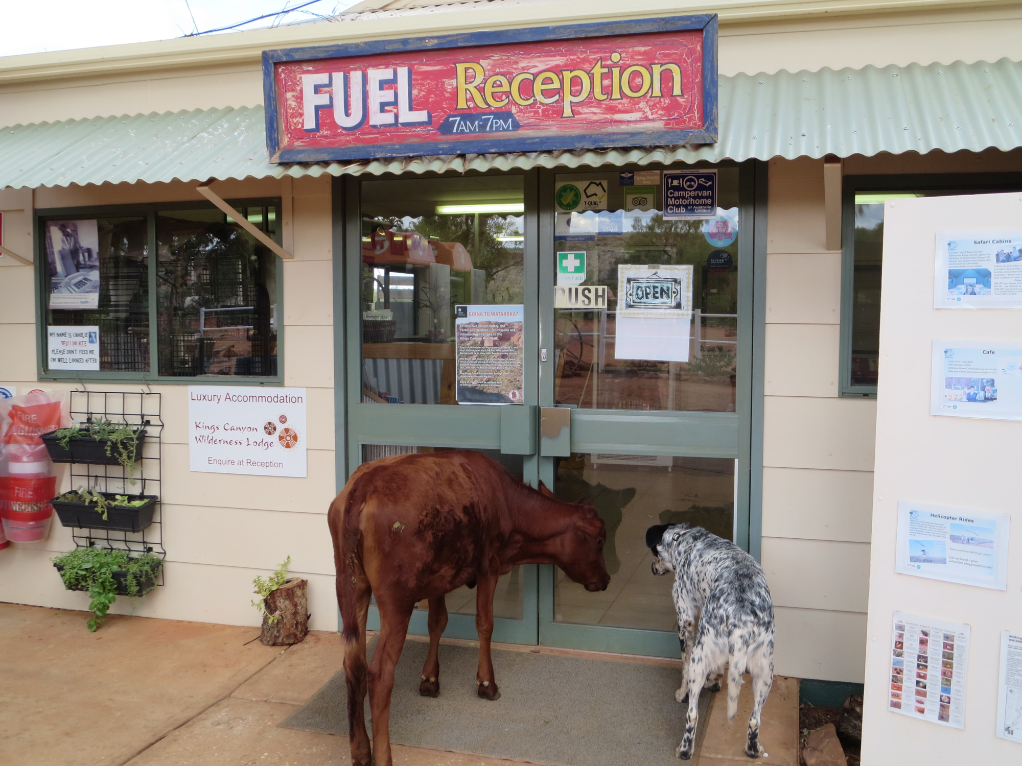 De King’s Canyon, nous revenons sur la Stuart Highway. En passant devant une station essence, on a le réflexe du bush: s’arrêter systématiquement, même si la jauge affiche un niveau raisonnable. On ne sait jamais quand la prochaine station se présentera. Et comme on est au milieu du bush, il y a pour nous accueillir devant la réception, une bête assez inattendue. Imaginez la même chose à une station de la région parisienne.