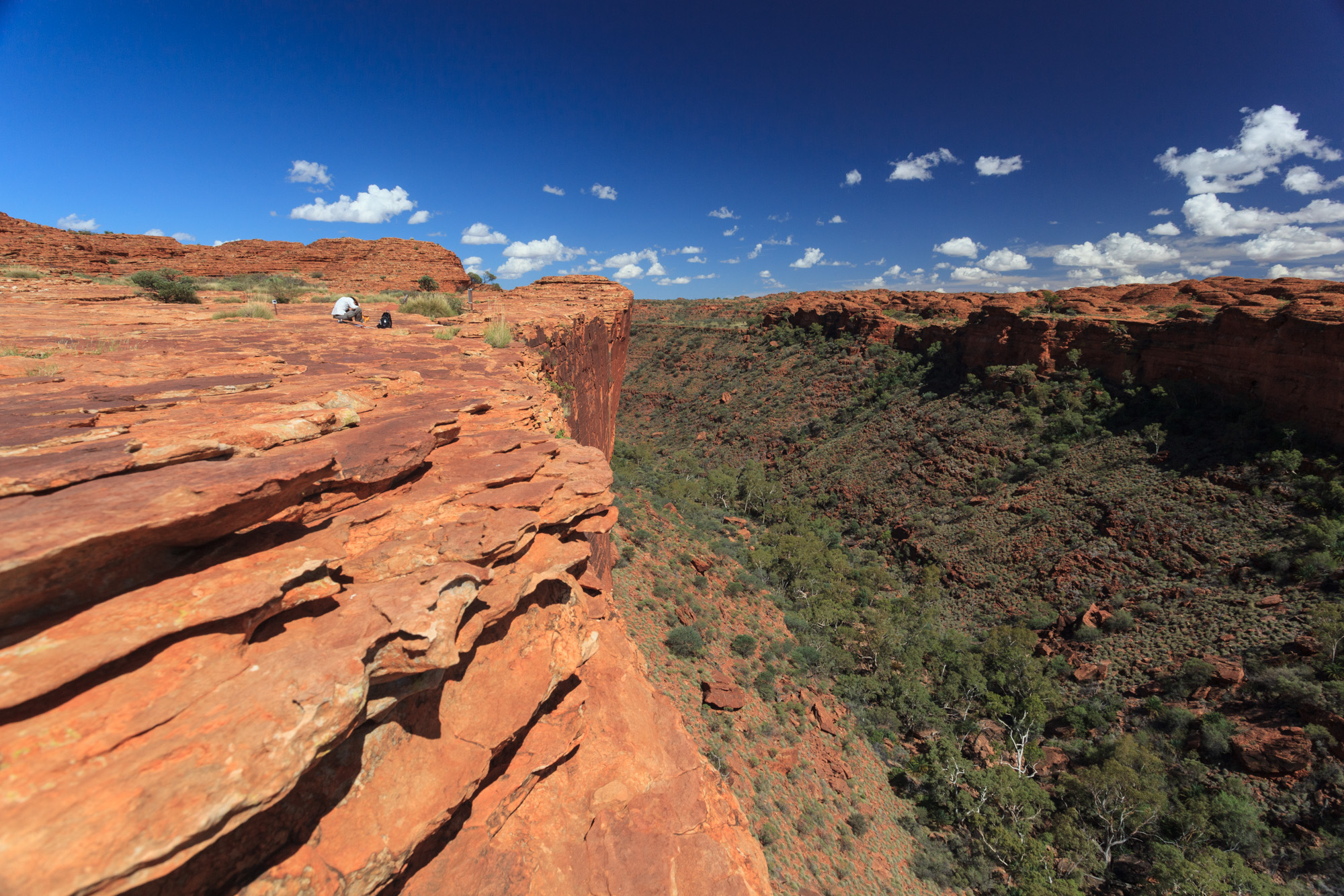 Nous arrivons à King’s Canyon. Cet endroit est aussi considéré comme un site sacré par les Aborigènes. Il recèle d’herbes médicinales. Le canyon retient aussi les eaux de pluie dans des bassins devenus lieux de rituels pour les natifs. Nous nous élevons pour gagner la rive sud du canyon. De là, nous bénéficions d’une splendide vue sur le fond du canyon et sur les parois abruptes de la rive nord.