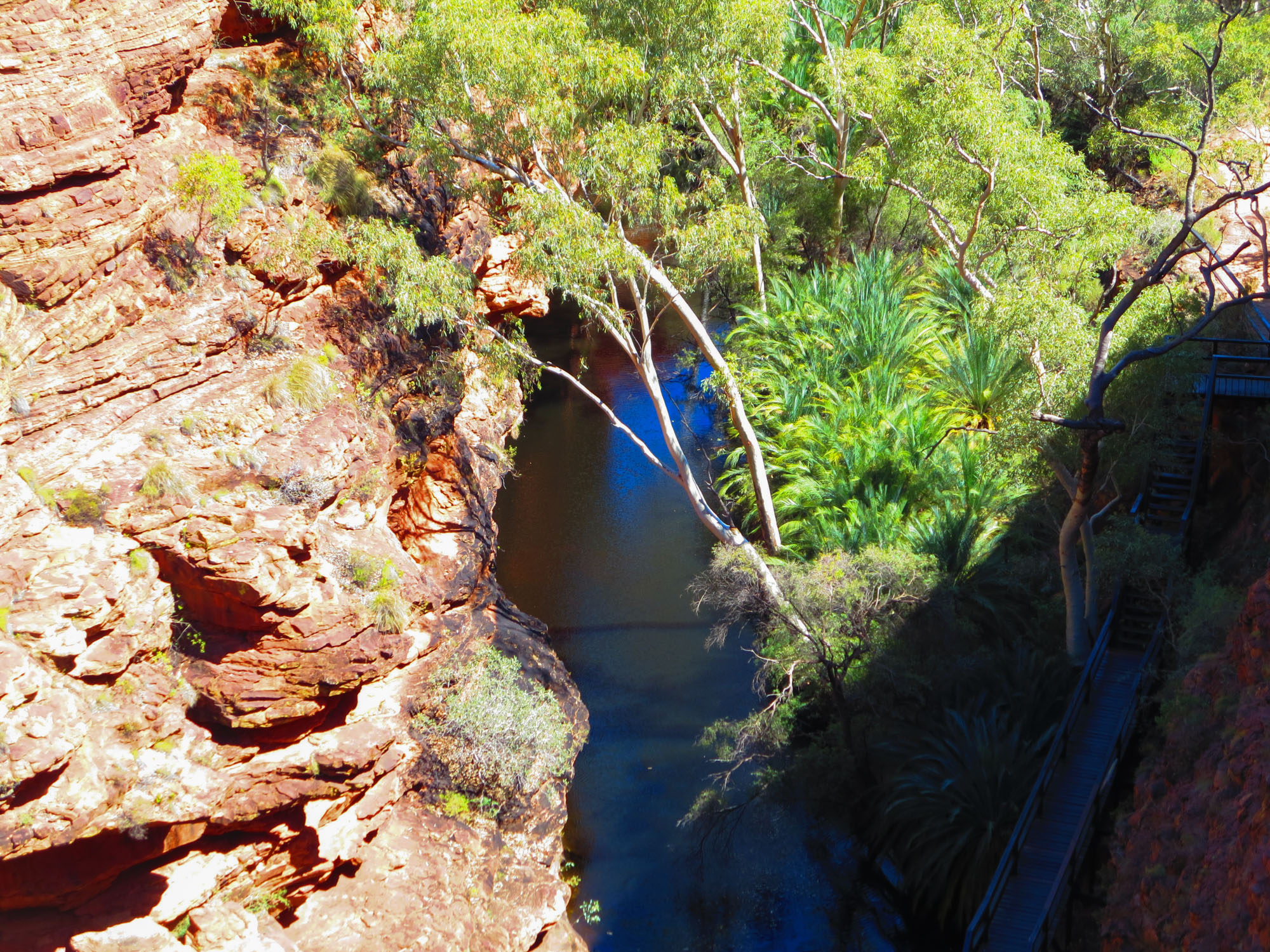 Nous descendons ensuite dans une gorge secondaire. Le Garden of Eden abrite les fameuses retenues d’eau sacrées. On y accède par une succession d’escaliers. L’endroit est magique. La végétation luxuriante de la gorge contraste avec l’aridité du plateau de roche rouge situé une trentaine de mètres plus haut.