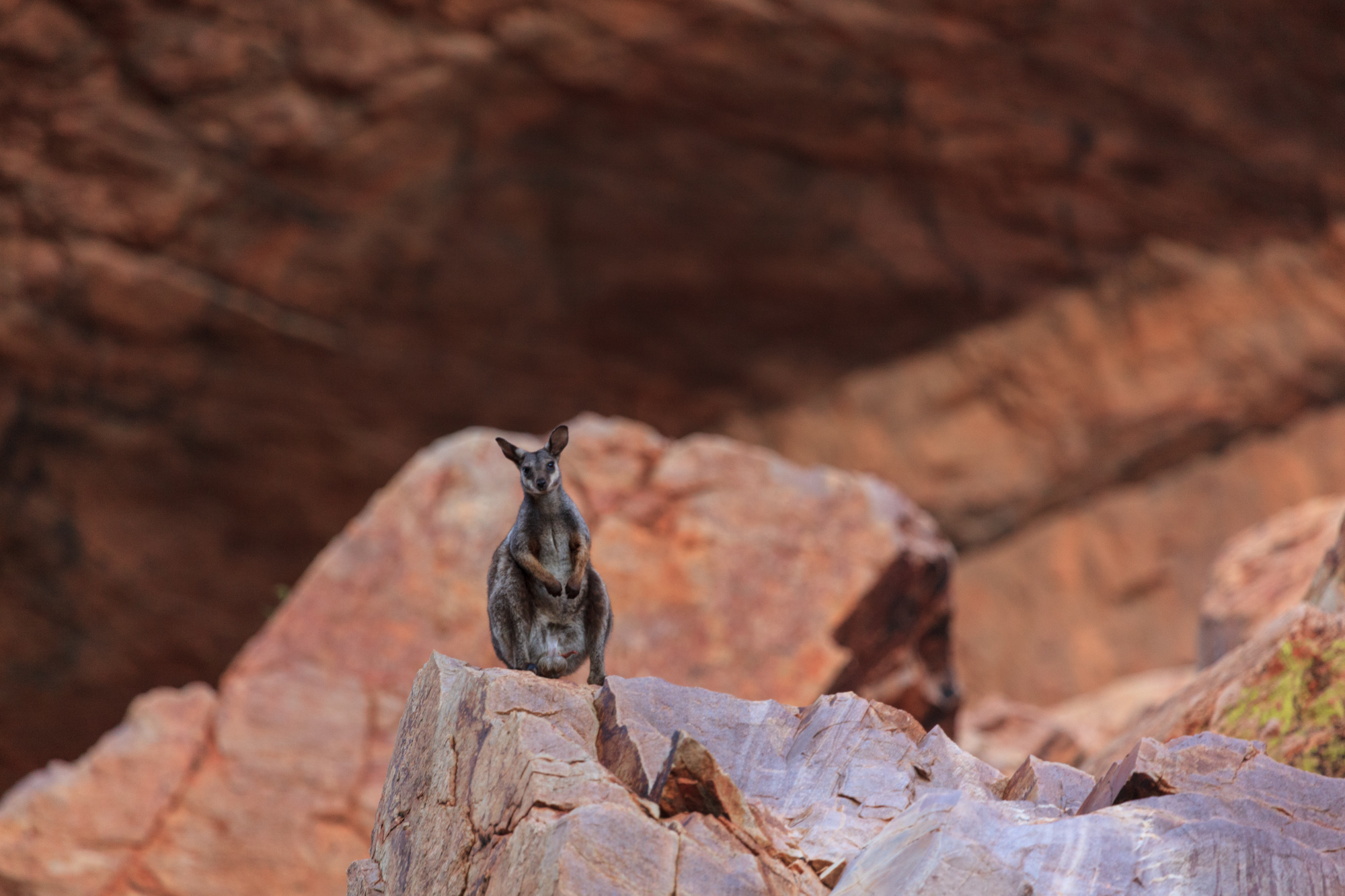 Comme il nous l’a conseillé, nous filons vers un lieu nommé Simpson Gap. Une brèche dans la chaine de montagne. Un trou d’eau s’est formé, qui attire toute une faune variée. Le lieu est connu pour la présence de black footed rock wallabies. Des kangourous miniatures qui vivent dans les rochers. Après quelques minutes d’observation, on les voit sortir de leur cachette. Le mâle dominant reste en hauteur…pour nous dominer. Après on ne sait pas si c’est l’objectif de Nicolas ou la présence de nombreuses femelles, mais apparemment, quelque chose lui fait beaucoup d’effet…