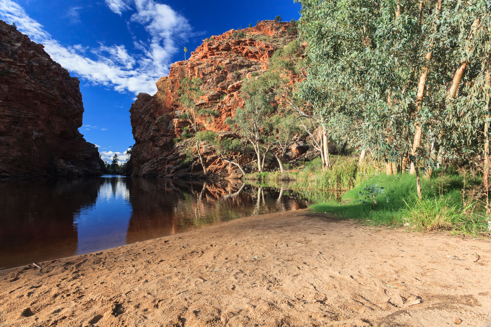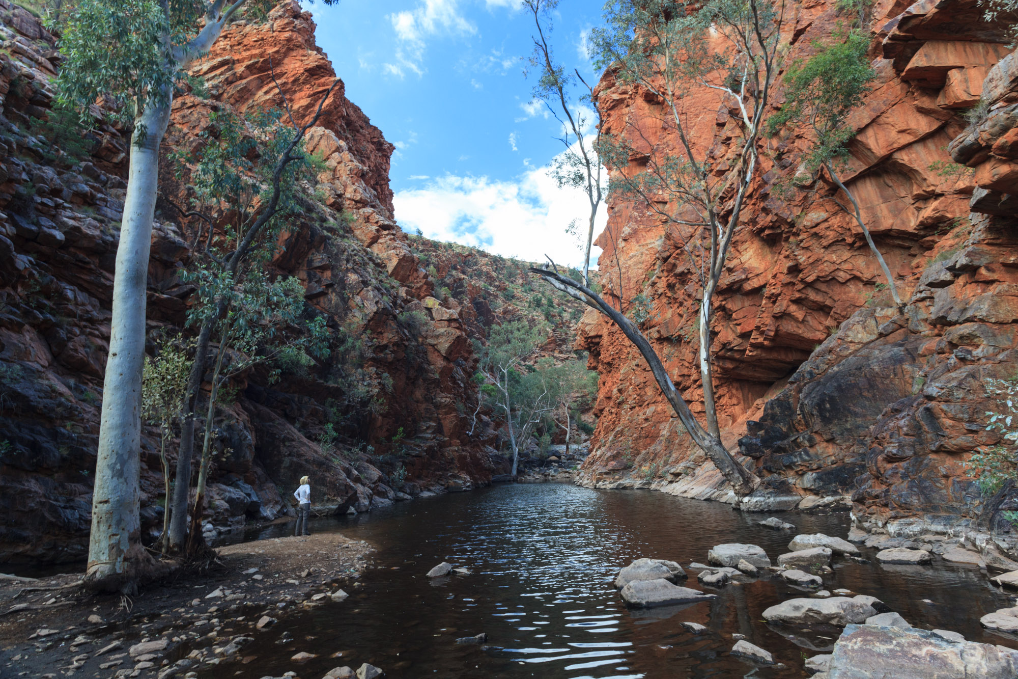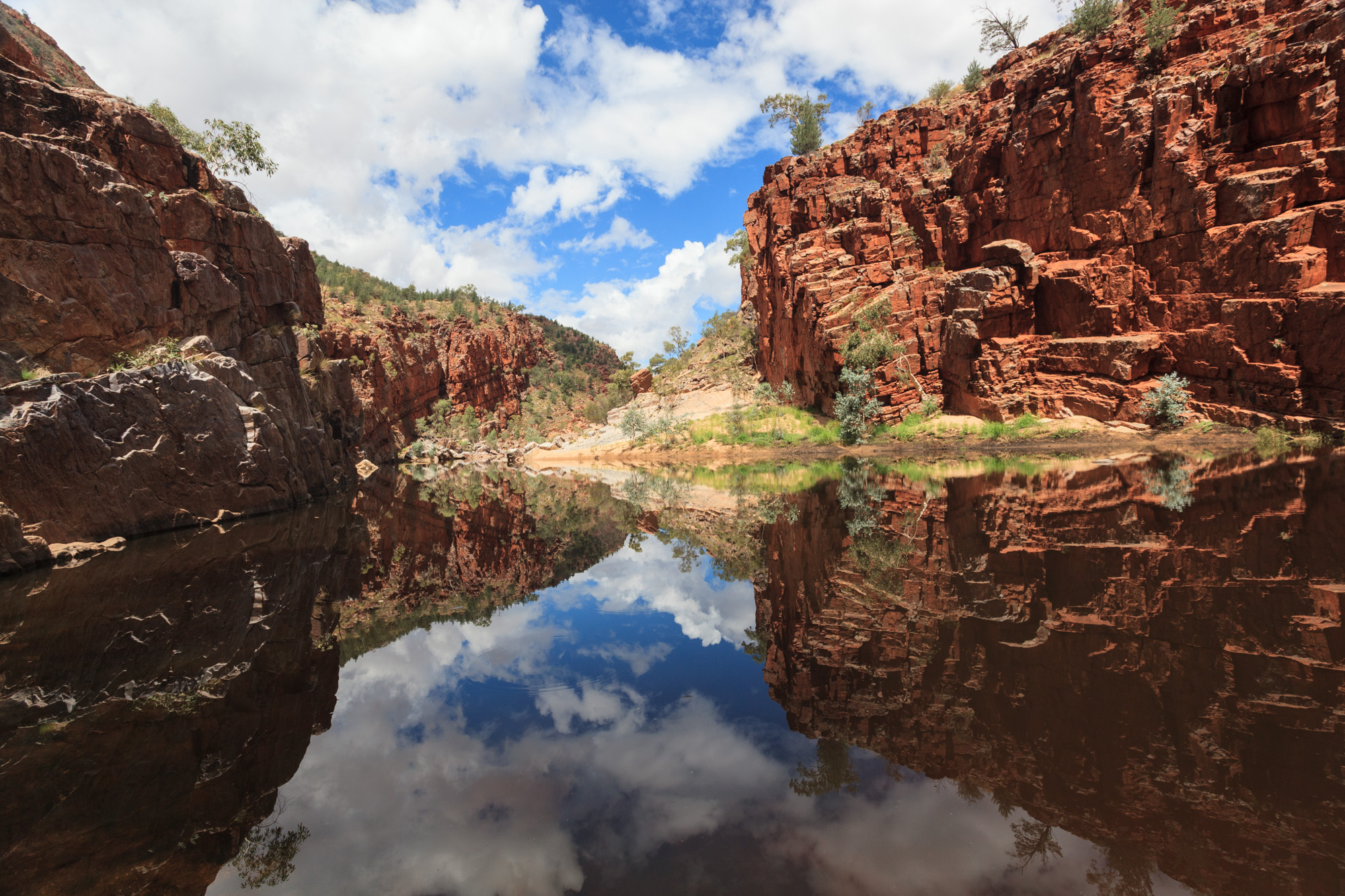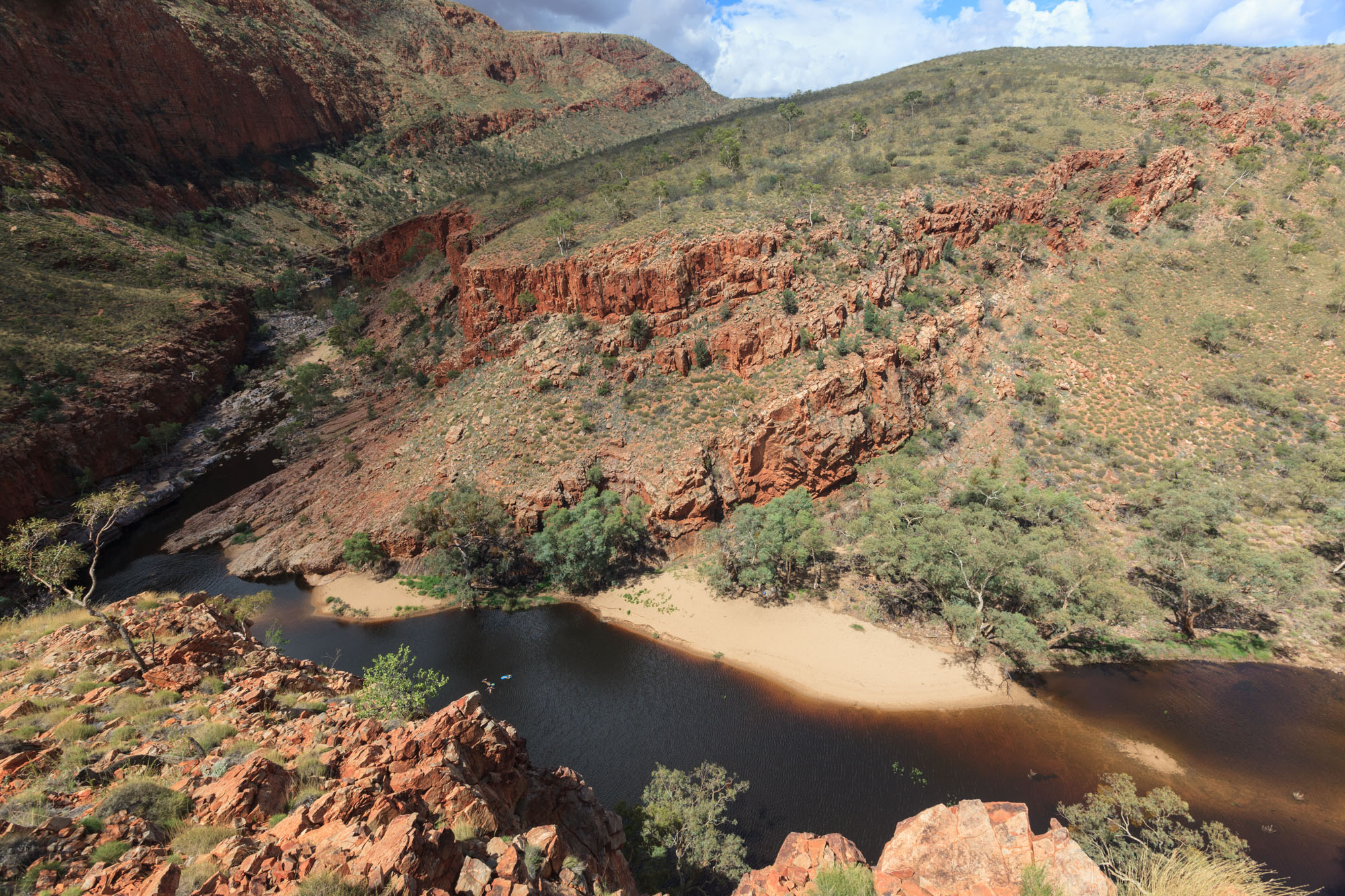 Glen Helen Gorge, Serpentine Gap, Ellery Big Hole. C’est toujours le même principe, mais c’est toujours aussi beau. Une faille dans la chaine montagneuse. Un trou d’eau. Des arbres et des arbustes plus verts qu’ailleurs qui contrastent avec le rouge de la roche.