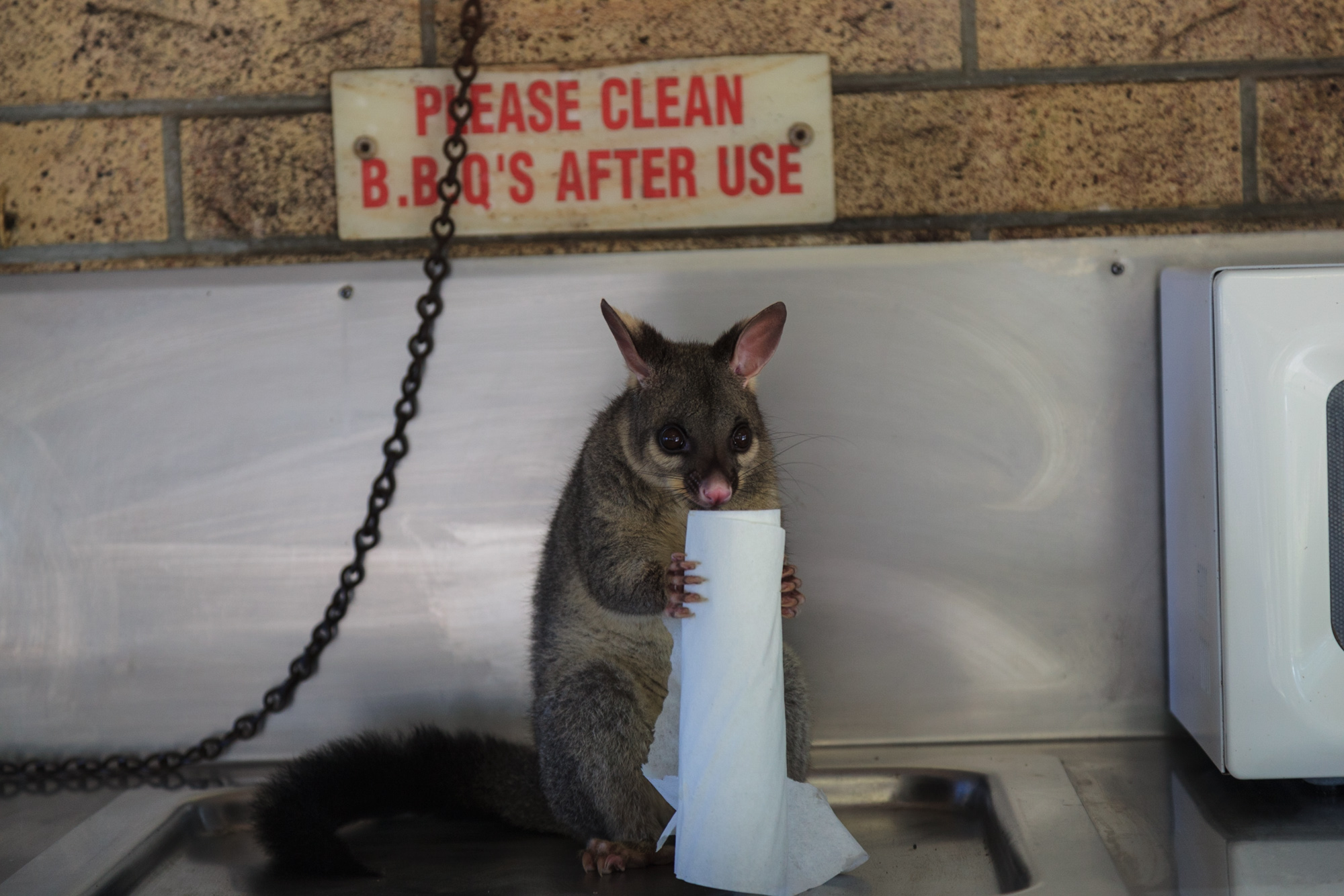 autre marsupial notable de ces contrées, l’opossum est un animal arboricole nocturne. Enfin, quand il n’a pas été complètement dénaturé par l’homme comme celui sur la photo. Ce dernier a élu domicile dans la cuisine d’un camping de la côte. Il attend, en journée, que des campeurs lui refile une partie de leur repas.