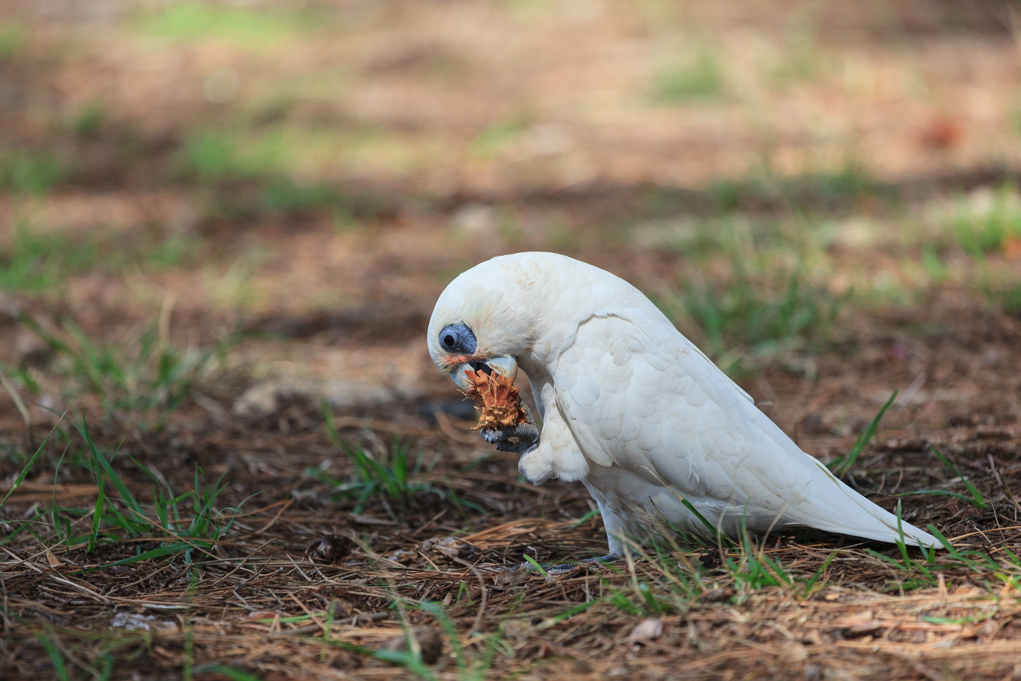 blanc avec une crête jaune, il est TRES bruyant parce qu’il se chamaille sans cesse avec ses congénères. Il prend aussi des poses hilarantes pour manger ses pommes de pin…