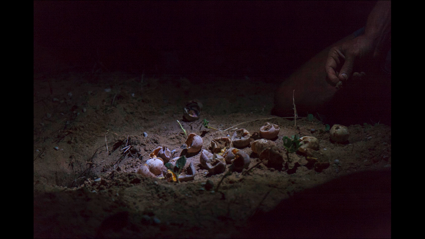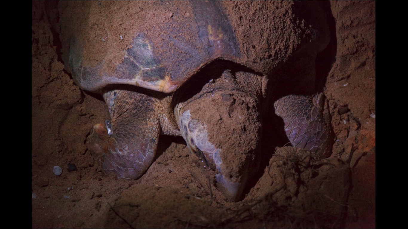 De nuit, elles sortent péniblement de l’eau, se hissent sur la plage en laissant derrière elles de caractéristiques empreintes de roues de tracteur. Arrivées en haut de la plage, à un endroit où le sable a la consistance correcte pour créer une chambre susceptible d’accueillir l’abondante couvée, la tortue creuse, méthodiquement un trou avec ses deux pattes arrières.