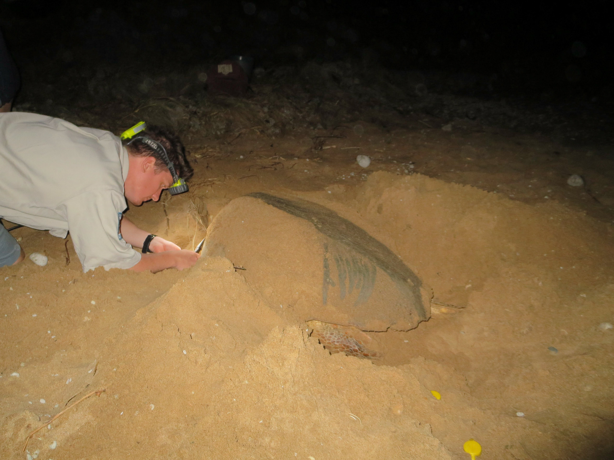 Elle met une bonne demi-heure pour y lâcher sa centaine de cocos. Ensuite, elle enterre ses oeufs et redescend lourdement la plage, trainant sa centaine de kilos sur le sable. Une fois les premières vagues atteintes, elle retrouve sa dextérité et hop, elle disparait dans le Pacifique. Elle reviendra certainement pondre de nouveau dans quelques jours ou quelques semaines. Puis, elle disparaitra pendant plusieurs années avant de revenir sur même plage. Le spécimen que vous voyez sur la photographie n’était pas revenu depuis 6 ans. C’est le numéro d’immatriculation gravé sur la bague placée sur sa nageoire qui en atteste.