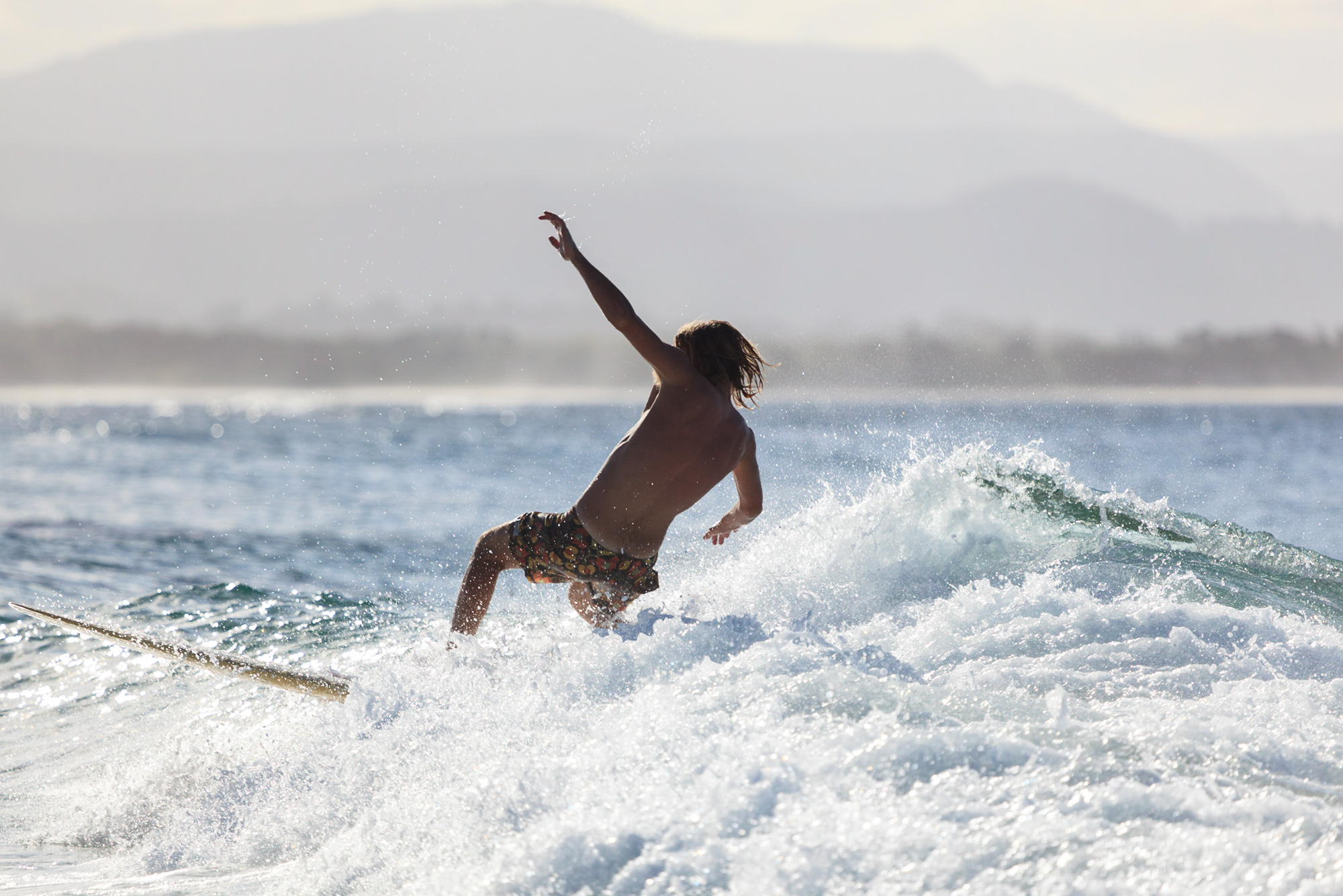 Miraculeusement, les surfeurs expérimentés se frayent, à coup de déhanchement, un chemin jusqu’à ce que la vague mourante se referme sur eux dans un gros bouillon.