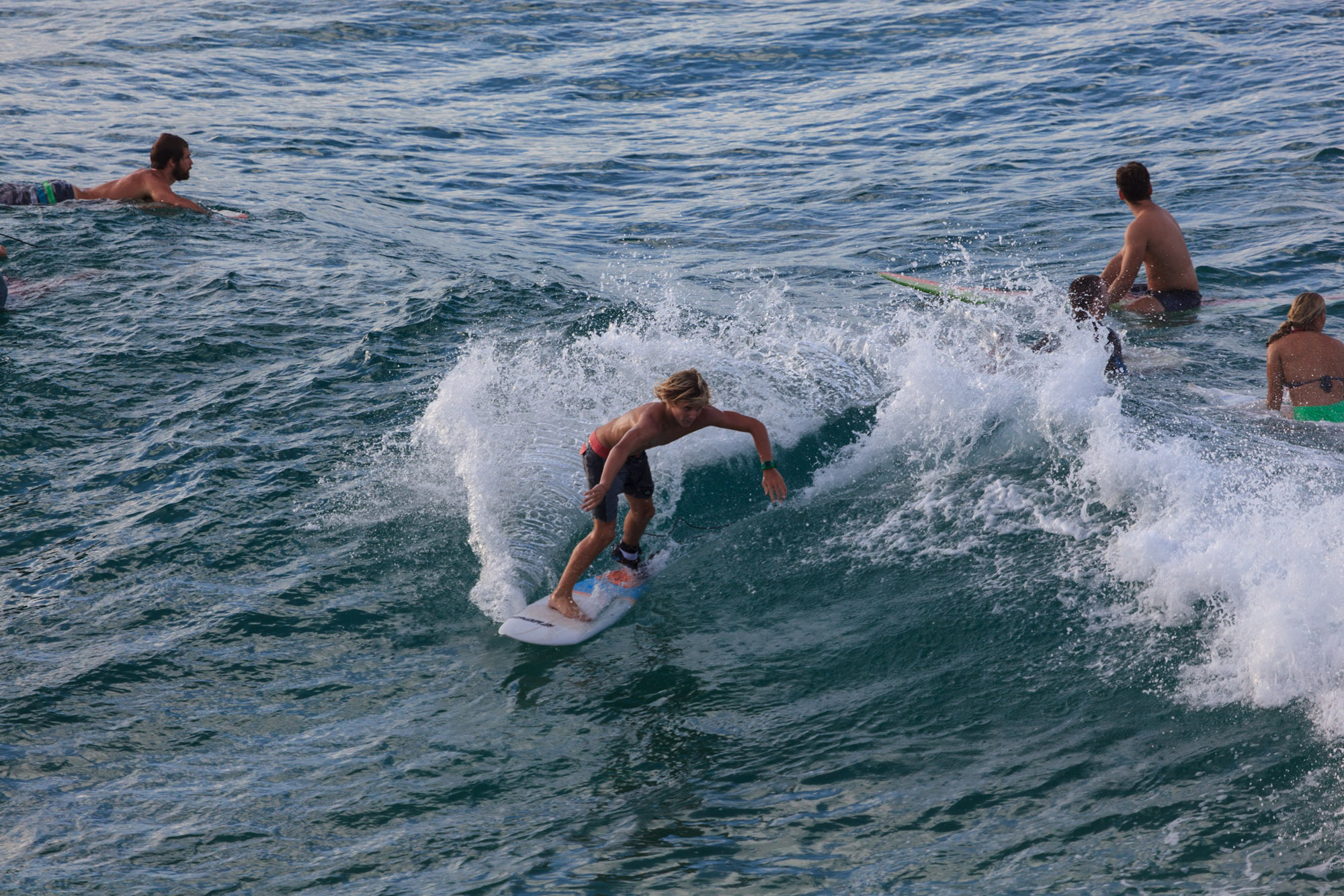 Des écoles proposent des cours de surf. Nous observons les apprentis surfeurs. Descente de la plage avec la planche en courant, on s’agenouille sur le surf et on pagaie avec les bras, virage et retour avec les vagues sur la plage… et on recommence, une bonne dizaine de fois pour gagner en assurance et en stabilité. A les regarder, on est déjà épuisés. Puis il y a les surfeurs professionnels, ceux qui viennent tous les jours pour taquiner la vague. A ce spot situé sur le bout de la plage, on croise hommes et femmes, toutes générations confondues. Il y a tellement de monde qui attend la vague que l’endroit est dangereux. En fait, la manoeuvre consiste à slalomer entre les gens.