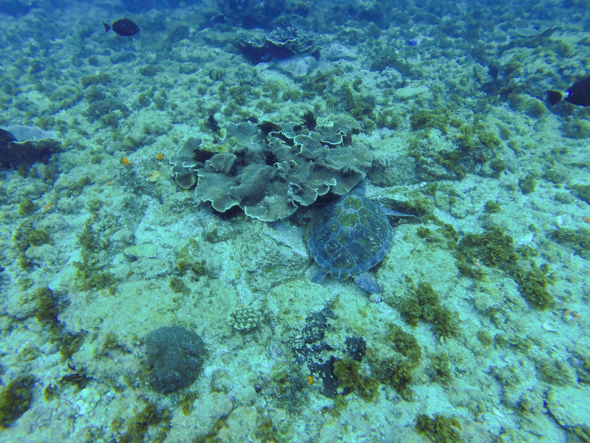 Des Kingfishes chassent à quelques coups de palme de là. En se laissant porter par le courant, on aperçoit une tortue marine qui nous accompagnera jusqu’à la fin de la plongée.
