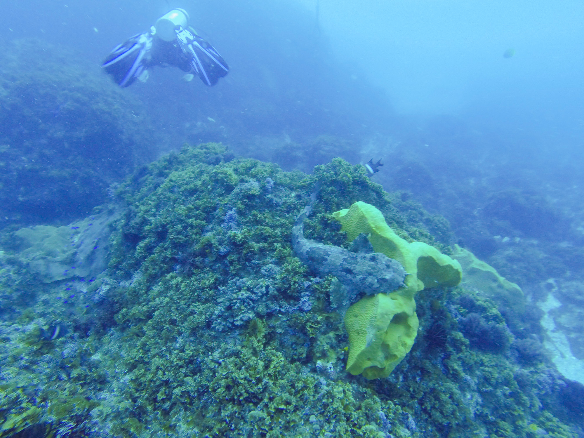 Une troupe de dauphins nous accompagne pendant quelques dizaines de mètres avant de prendre une autre direction. Vision enchanteresse ! Nous arrivons le coeur sur la main sur le site de plongée de Julian’s Rock. Sur ce type de bateau pneumatique, la mise à l’eau se fait en se laissant tomber en arrière. Nous devons immédiatement lutter contre le courant de surface pour atteindre la chaine d’ancrage. Sous l’eau c’est encore pire. Nous devons rester le plus proche possible du plancher pour ne pas nous faire emporter. Pour le reste, le paysage sous-marin est fascinant. Le “gros” est au rendez-vous. Un requin-léopard (inoffensif, on vous rassure) croise à quelques mètres de nous.