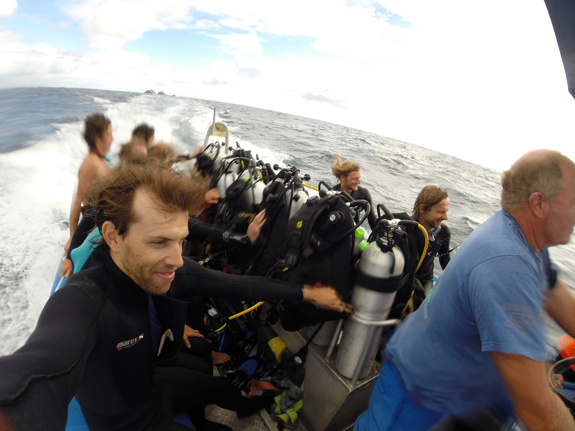 Byron Bay est à la croisée de deux courants marins: l’un chaud venu du nord et l’autre froid venu du sud, qui attirent une grande diversité de faune sous-marine. Nous nous rendons directement au centre de plongée pour réserver une place sur un bateau. Ce matin, Roger, le capitaine de l’embarcation qui nous emmène sur le site, lutte contre une forte houle. Les vagues font entre 3 et 4 mètres. Mon petit-déjeuner fait les montagnes russes.