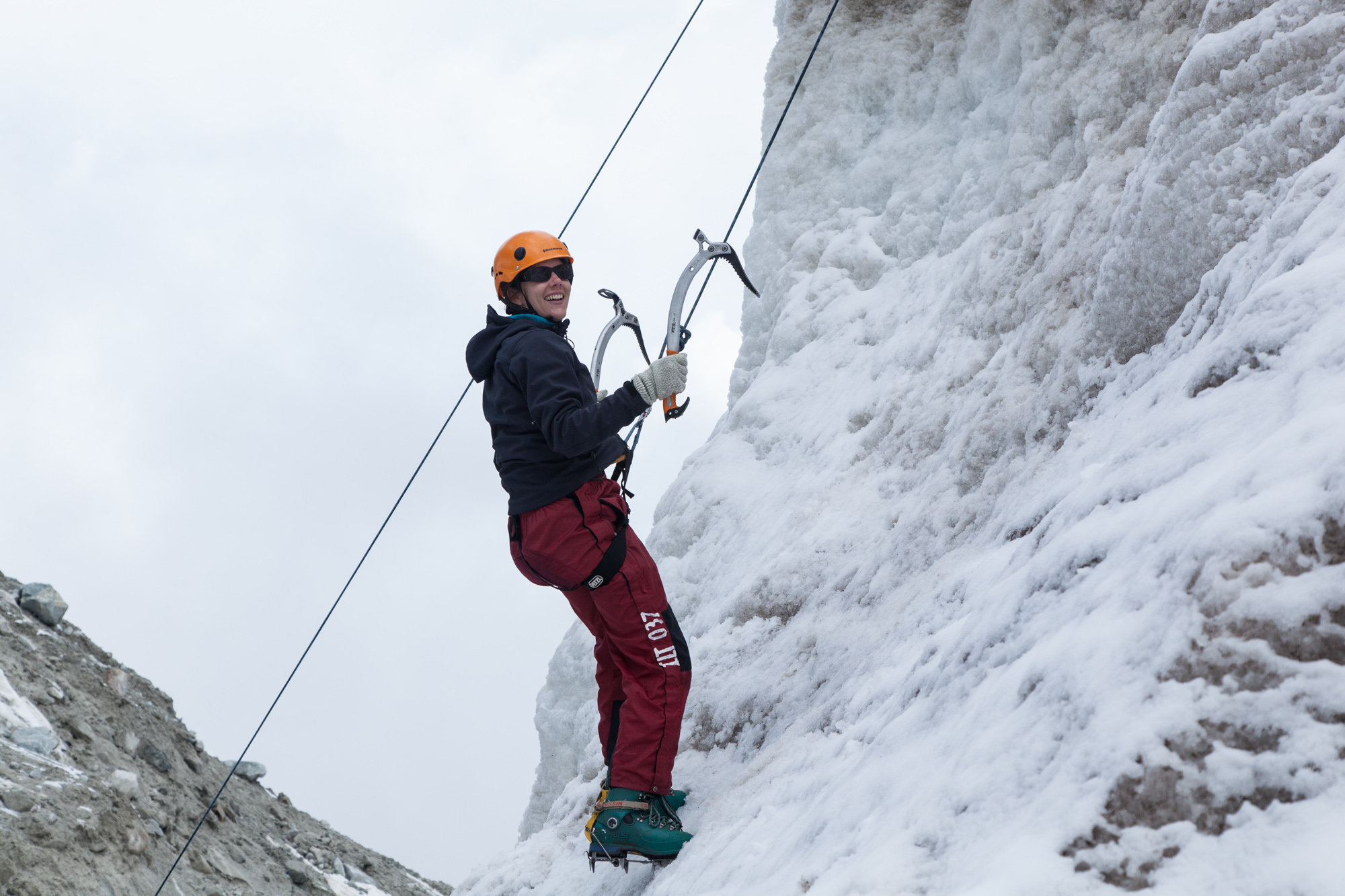 Le jour de notre départ, nous faisons connaissance avec Noémie et Anthony, aspirants au sommet, tambien. Le courant passe immédiatement. Ils contribueront à rendre notre séjour Huayna Potosien très agréable. Notre petite troupe accompagnée d’Hilario, notre guide, embarque avec le matériel et la nourriture, dans un combi qui nous mène en une bonne heure de conduite au premier camp de base du Huayna Potosi (4800 m). Après avoir déjeuné, nous enfilons le matériel et montons au pied du glacier pour nous entrainer à la marche sur glace avec crampons et piolet. Puis, pour le fun, parce qu’a priori, le Huayna Potosi ne présente pas de passage technique nécessitant la maitrise de l’escalade sur glace, nous sommes encordés pour une séance d’ascension verticale sur glacier. La discipline nous plait tout de suite. Des idées pour plus tard… Nous redescendons au premier camp de base pour notre première nuit d’acclimatation à une altitude équivalente à celle du toit de l’Europe.