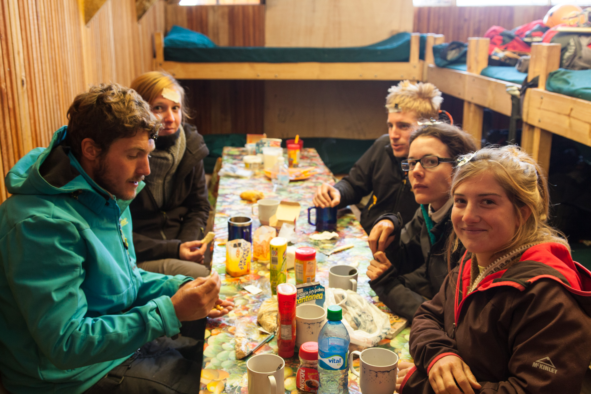 A 17h30, le diner est servi. A 18h30, extinction des feux. Bien évidemment, impossible de dormir à un horaire pareil. Je me retourne plusieurs dizaines de fois. Dehors, une tempête de neige se déchaine. Mauvais augure pour la suite. Quand j’arrive enfin à trouver le sommeil, ce n’est que pour une paire d’heures. Les lumières du refuge sont allumées à minuit. On nous sert un petit-déjeuner; afin de prendre des forces, je mange normalement mes deux petits pains et, erreur fatale, je prends un café au lait. Je n’ai pas entendu /compris les consignes d’Hilario de la veille au soir. Petit-déjeuner à la bolivienne: maté de coca et pas trop de nourriture.