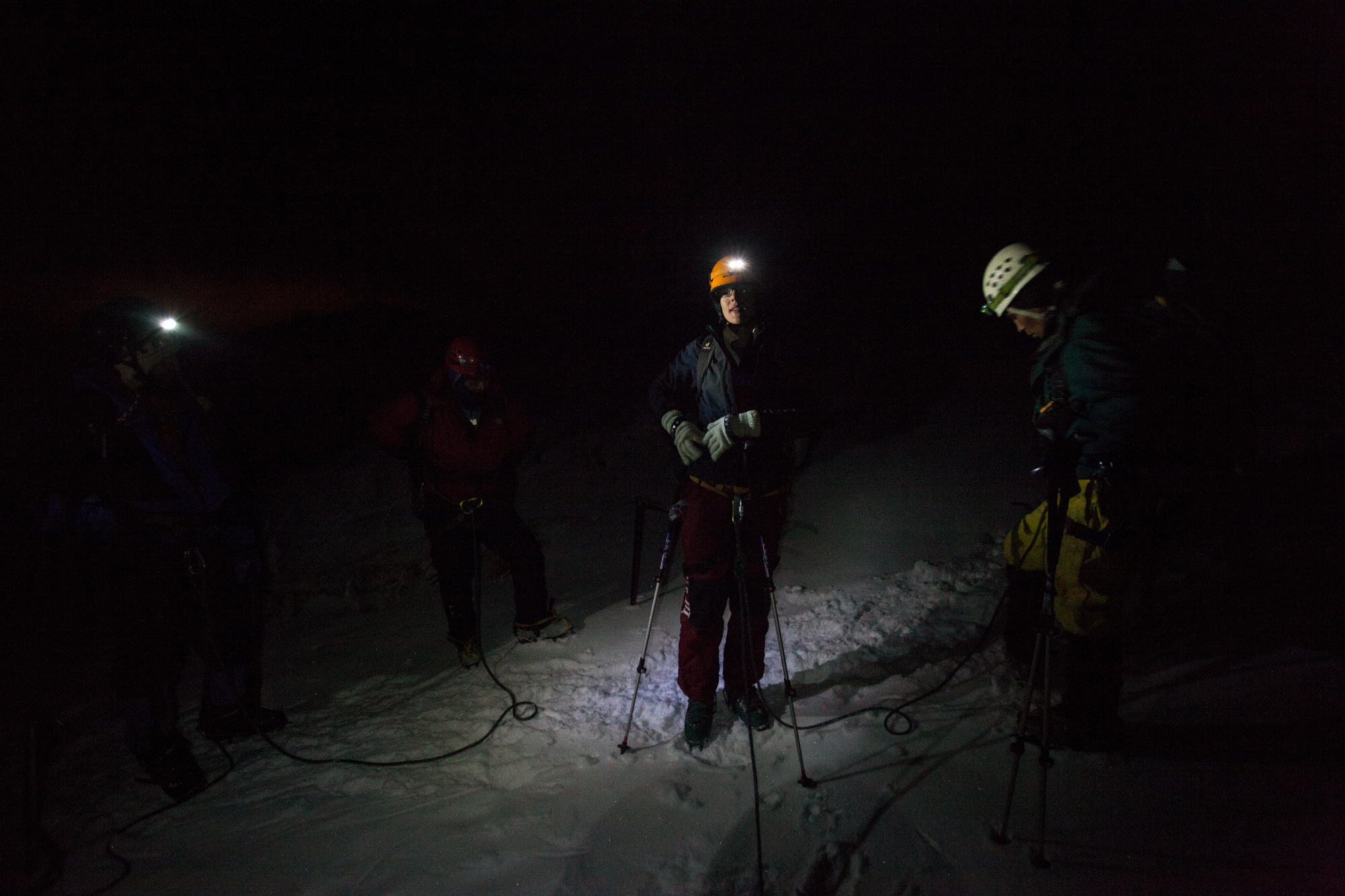 Nous nous équipons pour la montée et nous nous encordons. Nous commençons notre ascension vers 1h40. Il fait nuit noire. Les seules choses que nous apercevons sont La Paz et ses lumières sur notre gauche et le faisceau de la lampe frontale de nos compagnons d’aventure partis plus tôt car considérés par les guides comme plus lents. La tempête a laissé une couche de 15cm de neige, ce qui ne facilite pas notre sort.