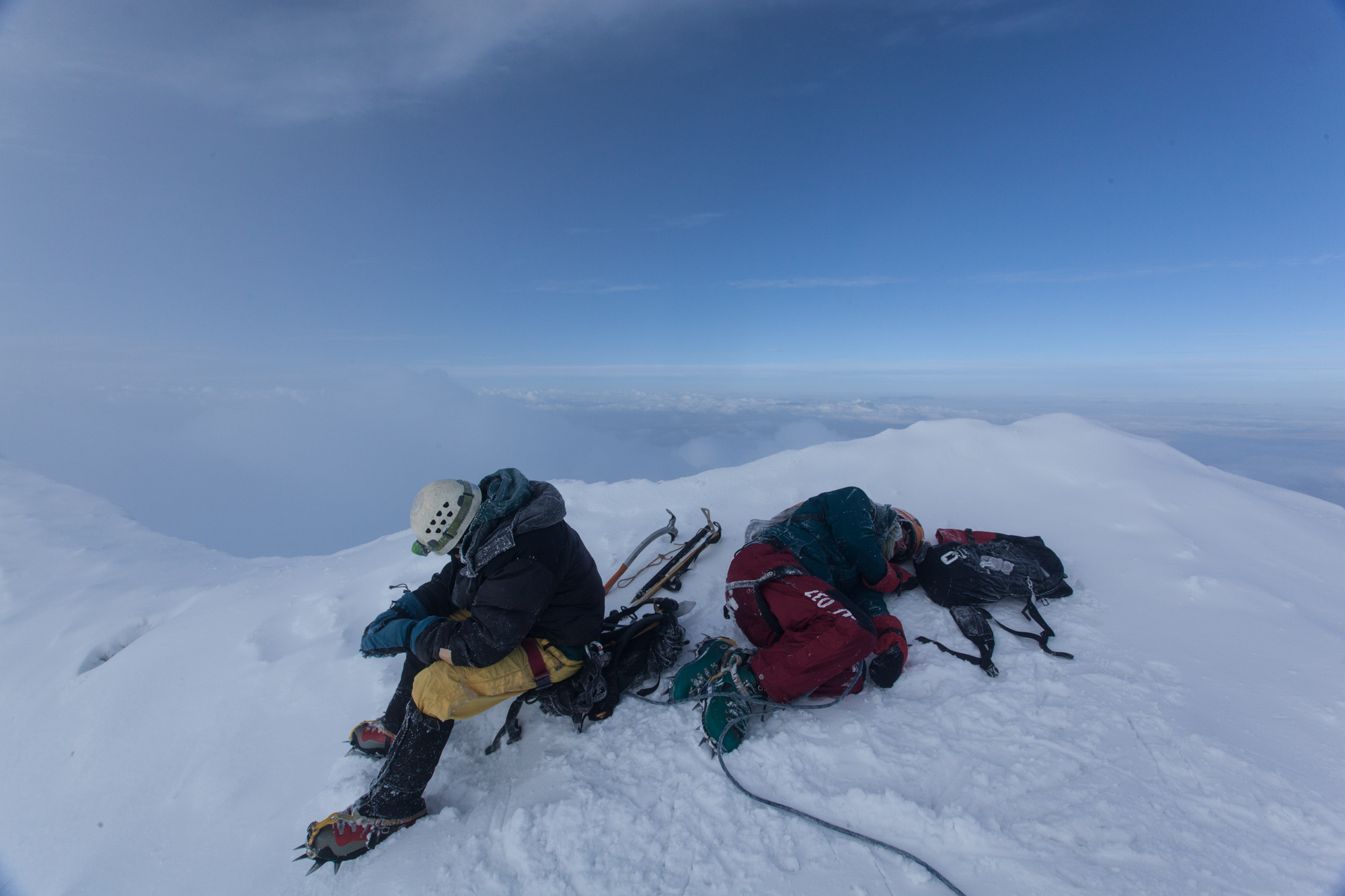 Nous arrivons les premiers au sommet. Je m’écroule et me mets en position foetal pour dormir. Je ne regarde même pas le paysage, je suis arrivée, c’est le principal. Le panorama est de toute façon bouché par un gros nuage. Je m’endors instantanément pour quelques minutes.