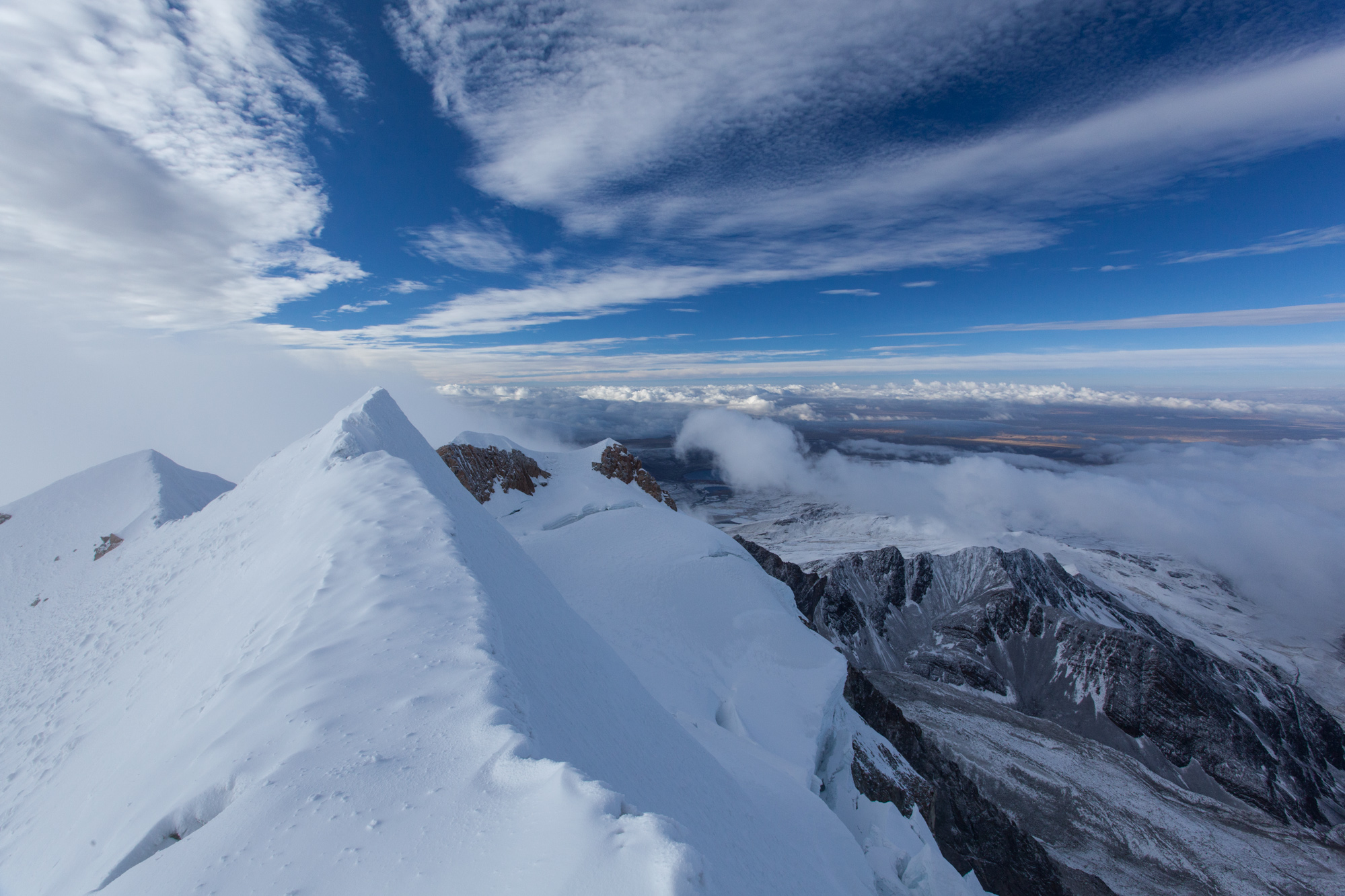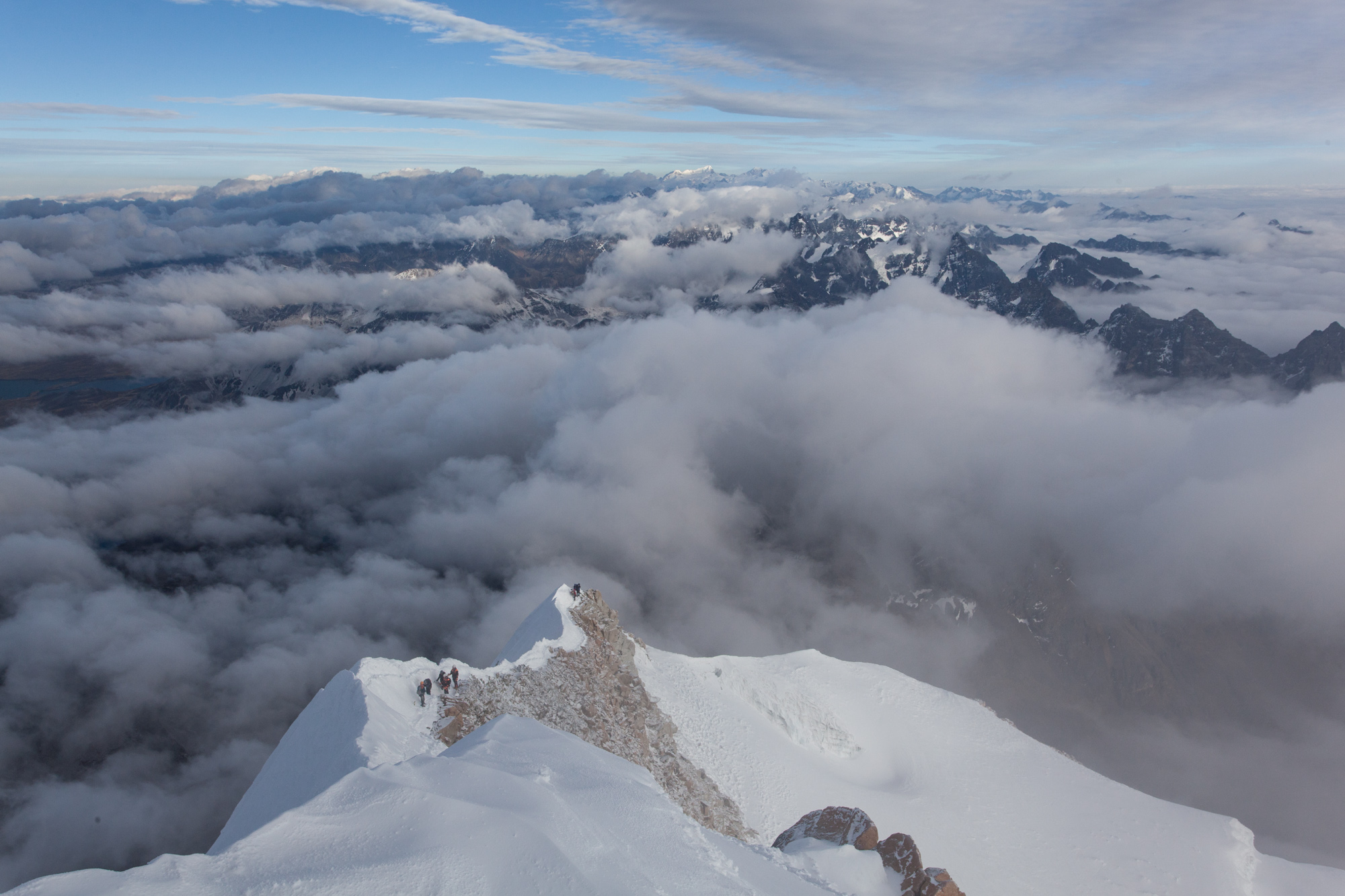 Nous atteignons l’arrête sommitale, un passage de 30cm de large. A droite, 1000m d’à-pic. A gauche, une pente presque verticale de 300m. Pas le droit à l’erreur. J’ai peur pour Nicolas qui est sujet au vertige. Quant à moi, je n’ai plus la force d’avoir les jetons et essaye de me concentrer sur les pas d’Hilario.