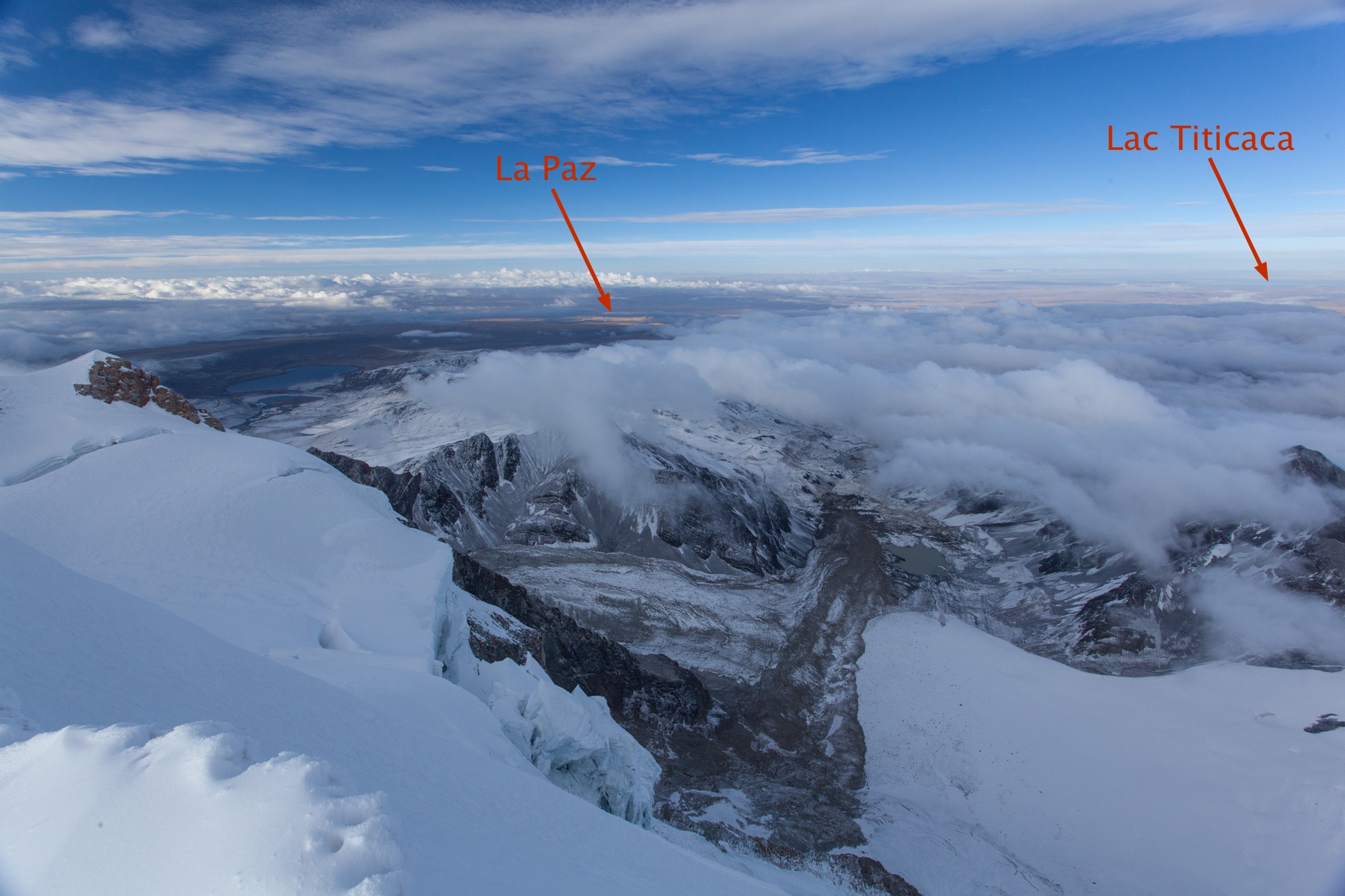 Je suis réveillée par les cris de Nicolas, appareil photo à la main: “Le Titicaca !! Le Titicaca !". Pendant mon sommeil, le nuage s’est déchiré. On voit effectivement le Titicaca ainsi que tous les sommets environnants EN DESSOUS de nous.