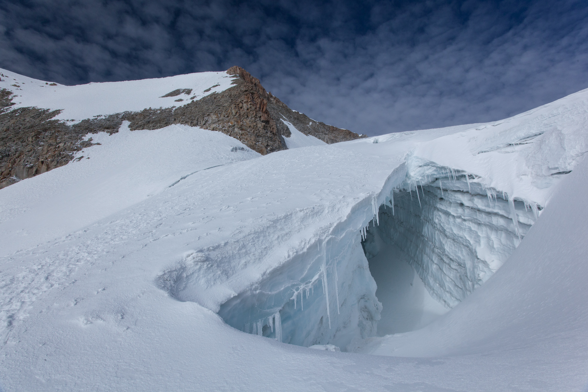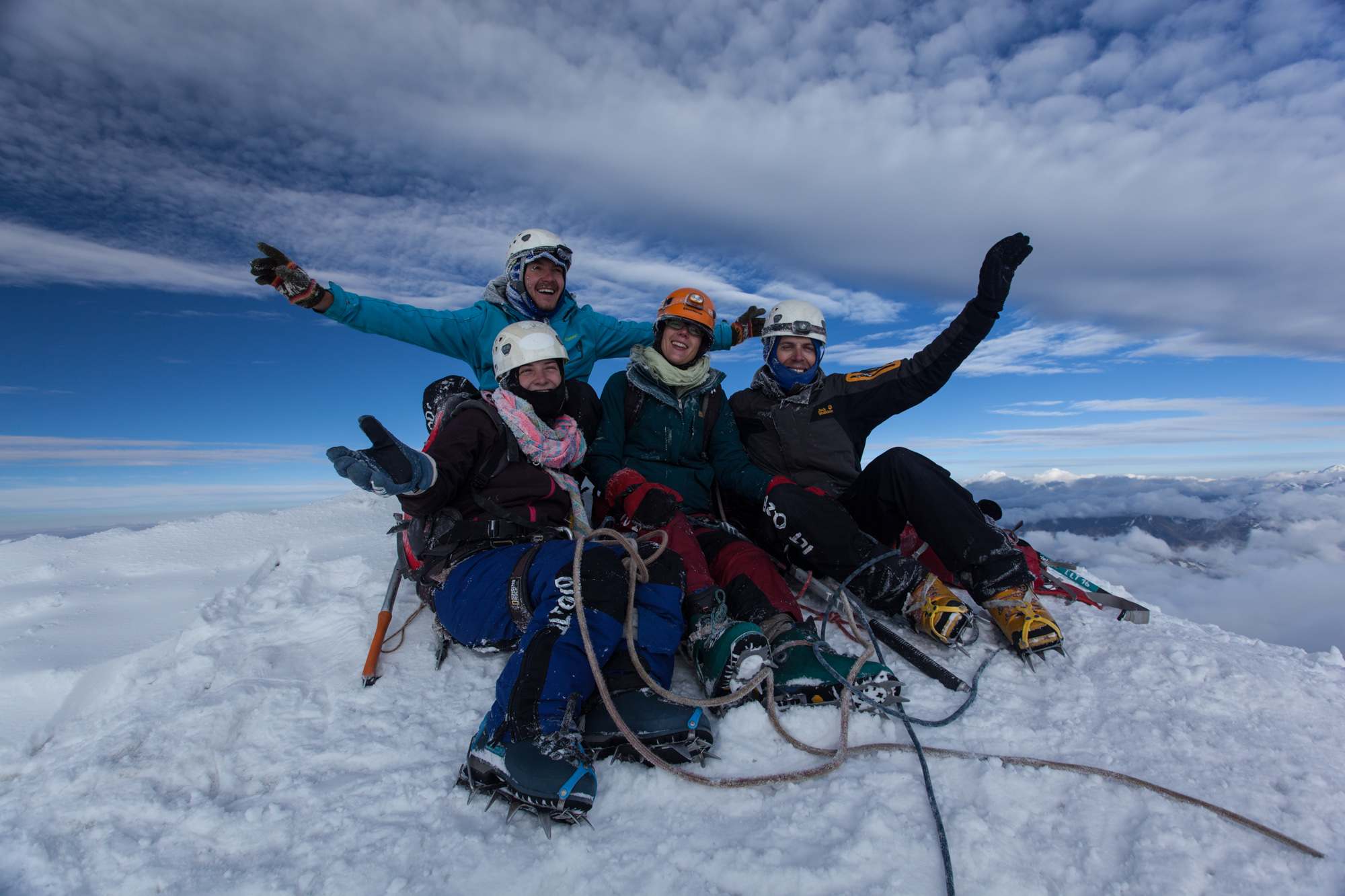 Ces quelques minutes de sommeil m’ont fait du bien et l’euphorie du sommet nous donne assez d’énergie pour redescendre. C’est lors de la descente que nous prenons véritablement conscience de la pente…et aussi de l’existence des crevasses et des trous que les guides nous ont fait éviter pendant la nuit. Morale de l’histoire: ne partez pas sans guide. Hilario est bon pour un pourboire conséquent (voire même un “pour manger”! ). Le paysage désormais ensoleillé est absolument magnifique. Grottes de glace avec stalactites et stalagmites bleutées, manteau neigeux immaculé, et montagnes alentours. Splendide !!!