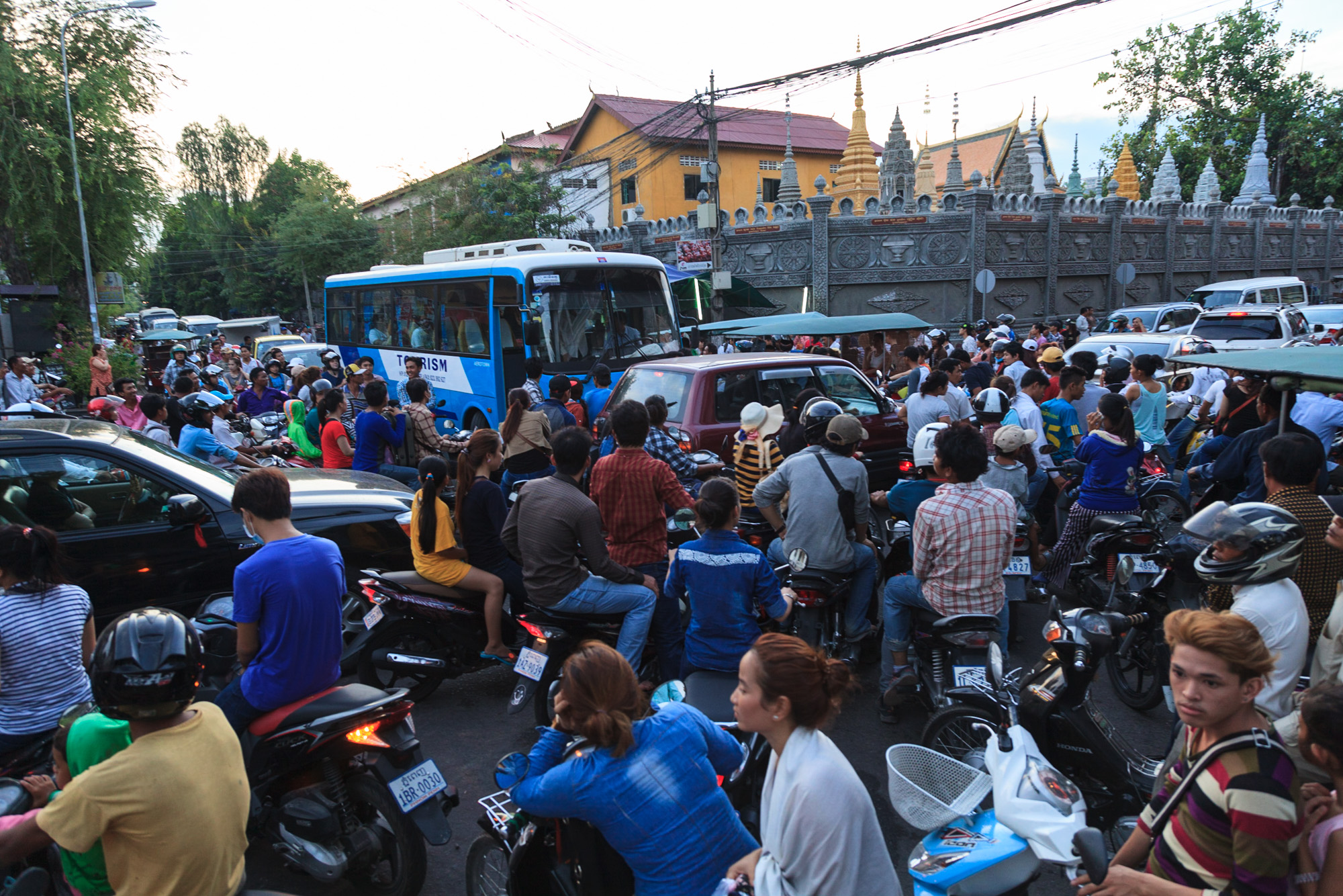 Malgré cet accompagnement privilégié, nous avons du mal à trouver du charme à cette ville. Autrefois, une des plus belles villes d’Asie du sud-est, Phnom Phen a subi les affres des Khmers rouges. Tous les bâtiments religieux ont été brûlés, les maisons bourgeoises symboles de capitalisme ont été détruites et la ville est tombée dans un marasme économique qui a achevé son délabrement. Aujourd’hui nous la trouvons insipide, encombrée et moche. Phnom Phen, c’est l’enfer des trekkeurs urbains: quand ils existent, les trottoirs sont défoncés ou bouchés par un enchevêtrement de marchandises ou de motos. Nos promenades se font directement dans les gaz d’échappement et nous sommes constamment frôlés par des motos pétaradantes, des camions surchargés et des voitures de nouveaux riches.