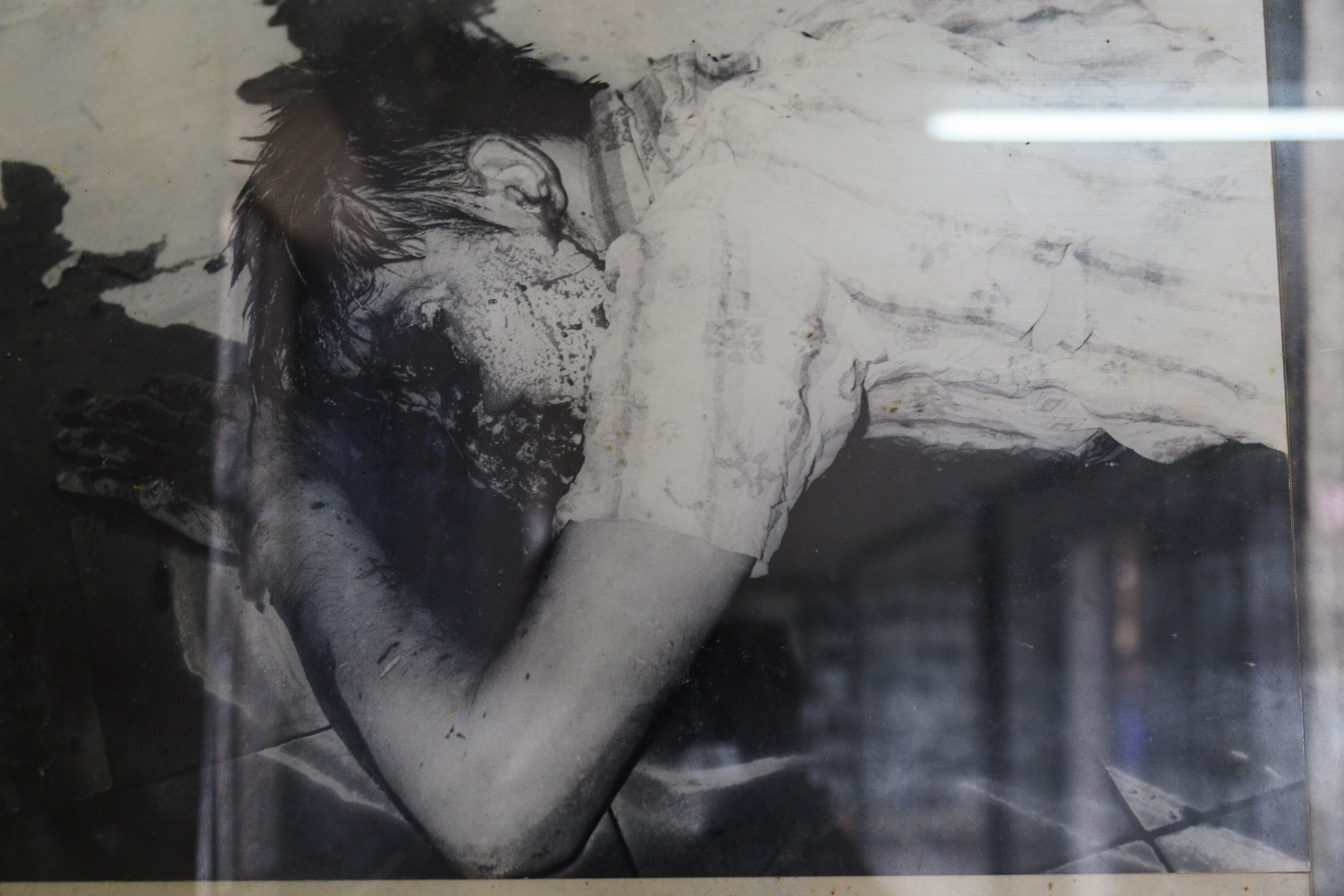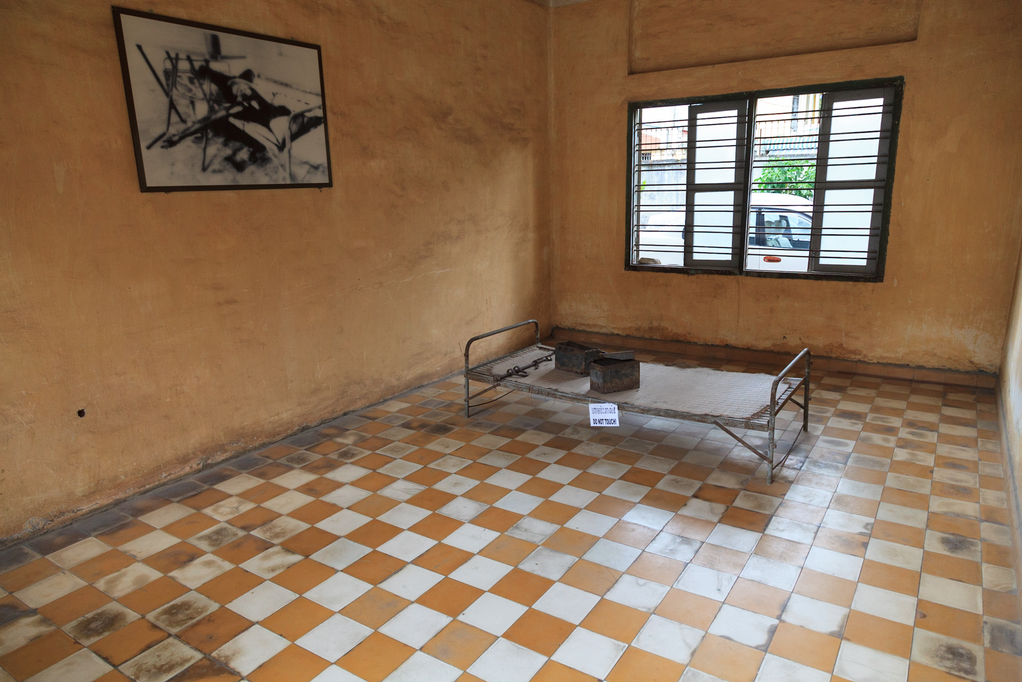 On commence par visiter les salles d’interrogatoire. Au milieu des anciennes salles de classe (il y a toujours les tableaux accrochés aux murs), un lit sans matelas dont le sommier métallique était branché sur le secteur. Des photographies accrochées aux murs montrent les salles telles qu’elles ont été découvertes par les Vietnamiens juste après l’évacuation du camp par les Khmers rouges. Les corps des victimes (celles enterrées dans la cours) gisent à terre le crâne éclaté ou sur les lits, le corps affreusement brûlé.