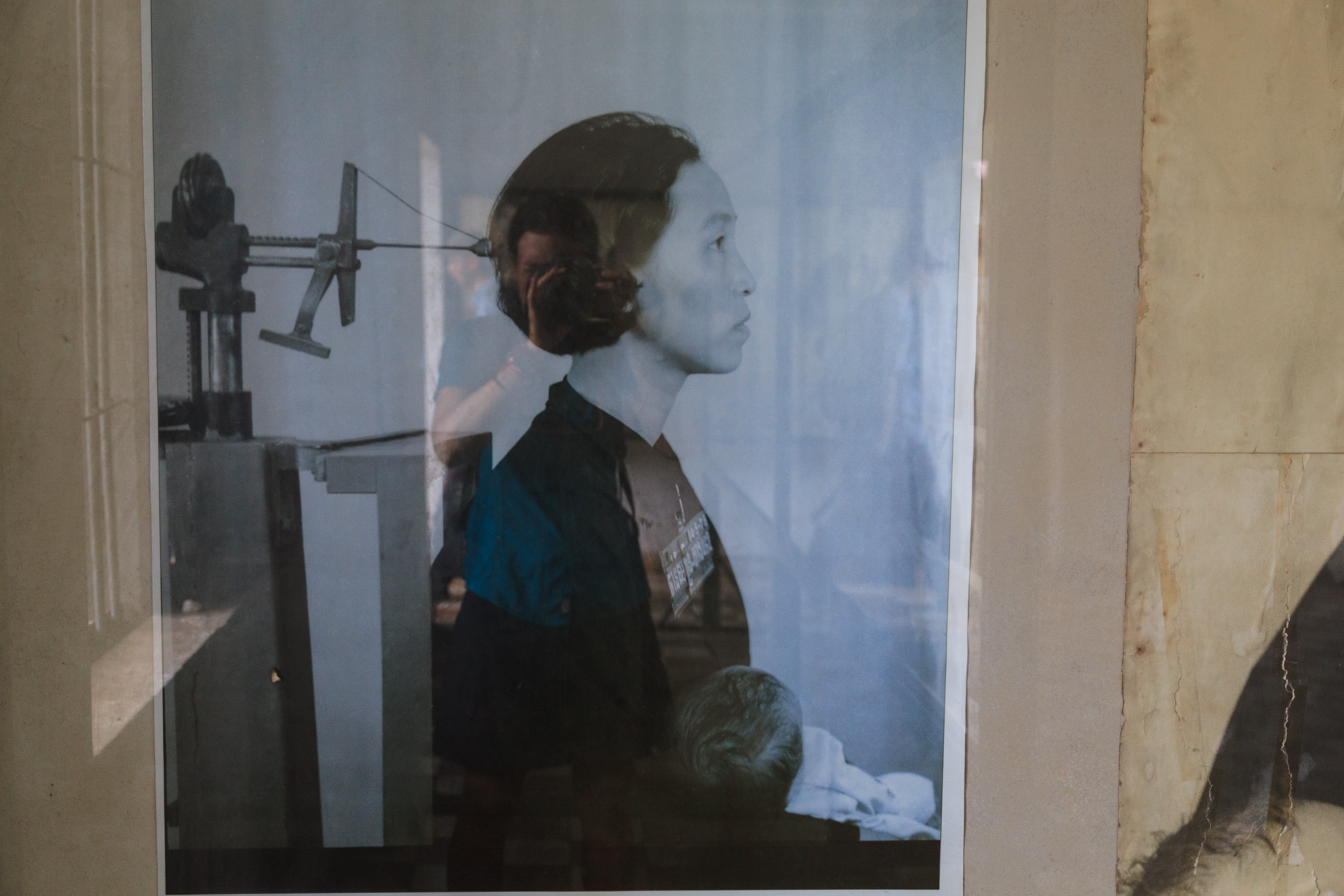 Ensuite, on rentre dans la salle des photographies. Les Khmers rouges étaient des maniaques de la documentation et de l’archivage. Ils prenaient en photo chaque personne qui entrait dans le camp. Une chaise montée d’un système de maintien de la tête permettait une standardisation des clichés.