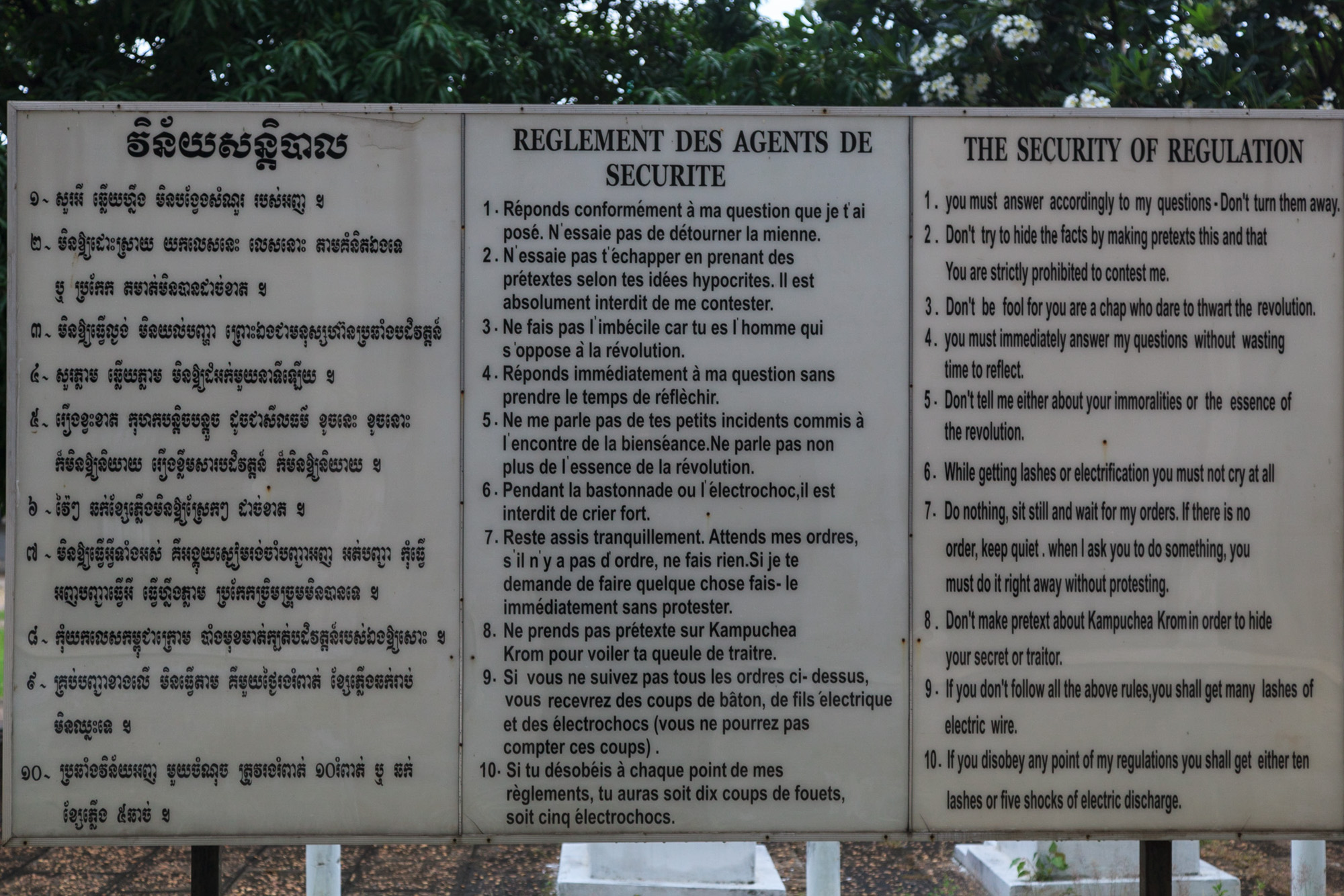 La première chose que l’on aperçoit, ce sont les tombes des 14 dernières victimes de S–21, retrouvées mortes, baignant dans leur sang, dans les salles de torture. Entre les tombes et les salles d’interrogatoire, on peut lire sur un grand panneau le règlement du camp. Il y a aussi des écriteaux qui recommandent le silence qui, de toute façon, tend à s’établir de lui-même.