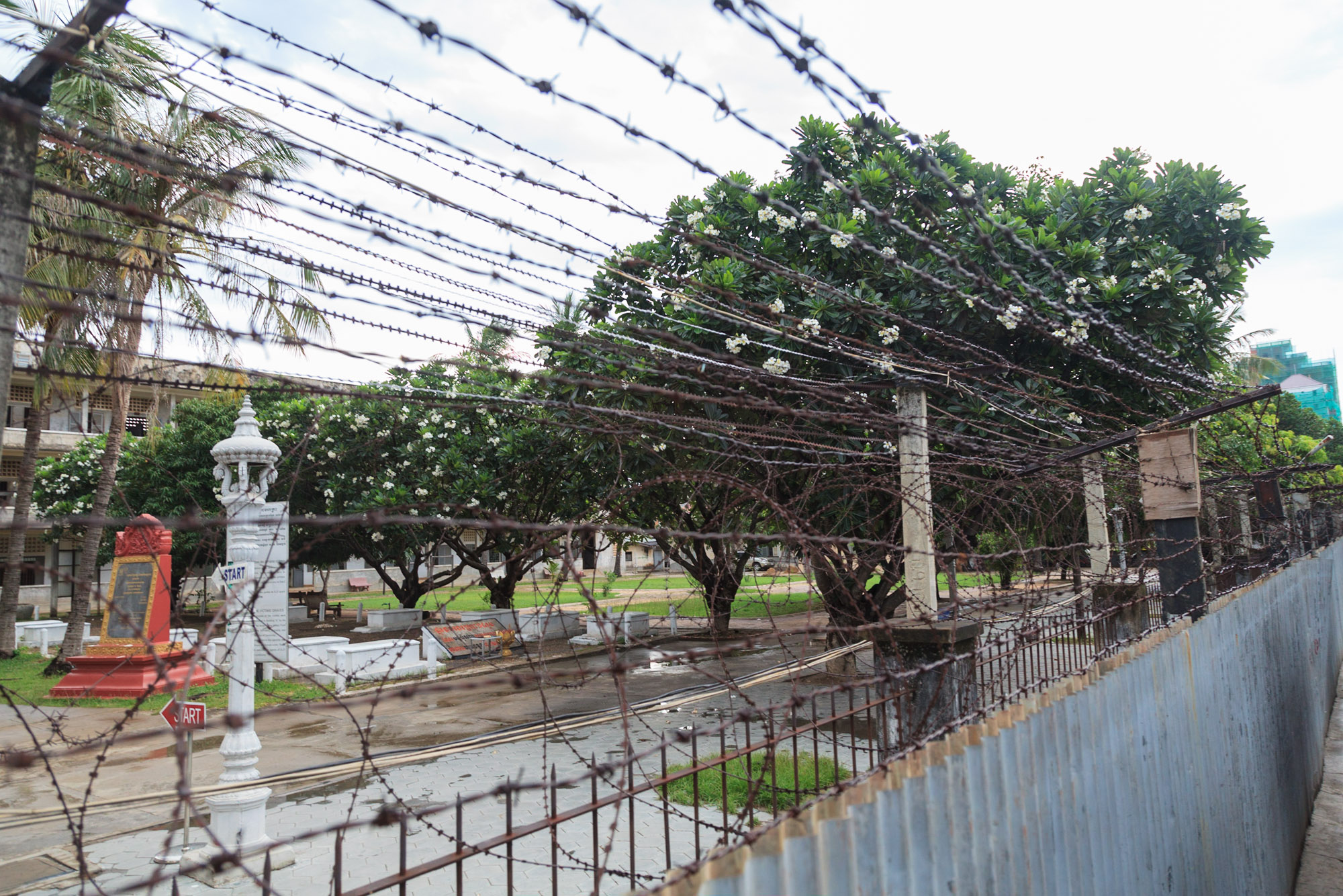 On entre dans Tuol Sleng par la cour du lycée encadrée de bâtiment à étages style années 30. Aux étages, des grillages en barbelés pour empêcher les prisonniers de se suicider par défenestration.