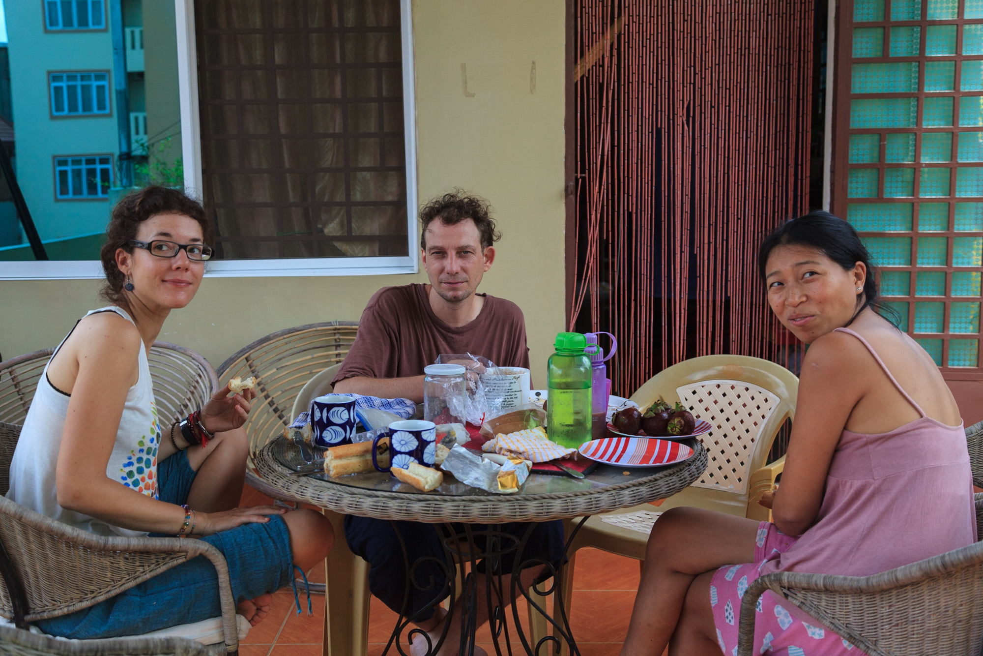 Nos amis Anna et Nico, installés depuis une dizaine d’années dans la capitale cambodgienne, nous accueillent. Les amis, c’est la dimension du quotidien qui nous manque le plus dans le voyage. Evidemment, on rencontre des gens qui deviennent aussi très rapidement des amis. Cependant, la plupart du temps, nos routes ne font que se croiser et il est difficile d’entretenir une relation de plus de quelques jours avec nos nouveaux compagnons. Il est aussi impossible de prévoir quand nous rencontrerons les prochains. Alors cette étape nous fait du bien. Nous squattons cinq jours chez Anna, Nico et Zia (qui est venue agrandir la famille depuis peu).