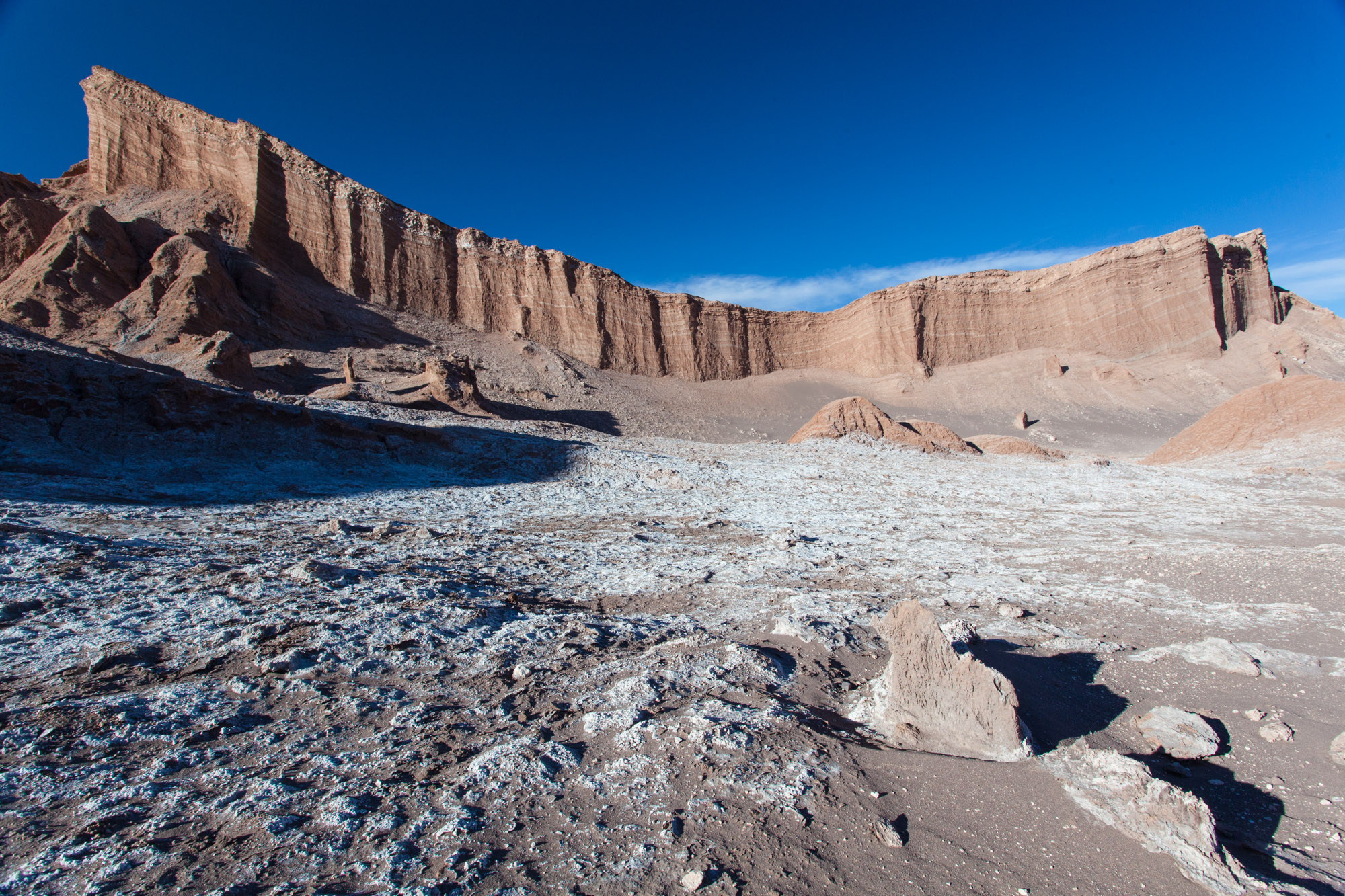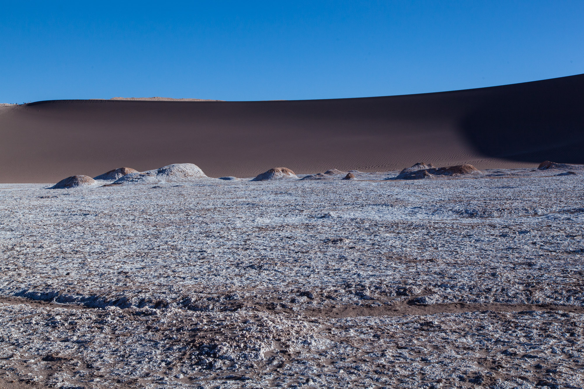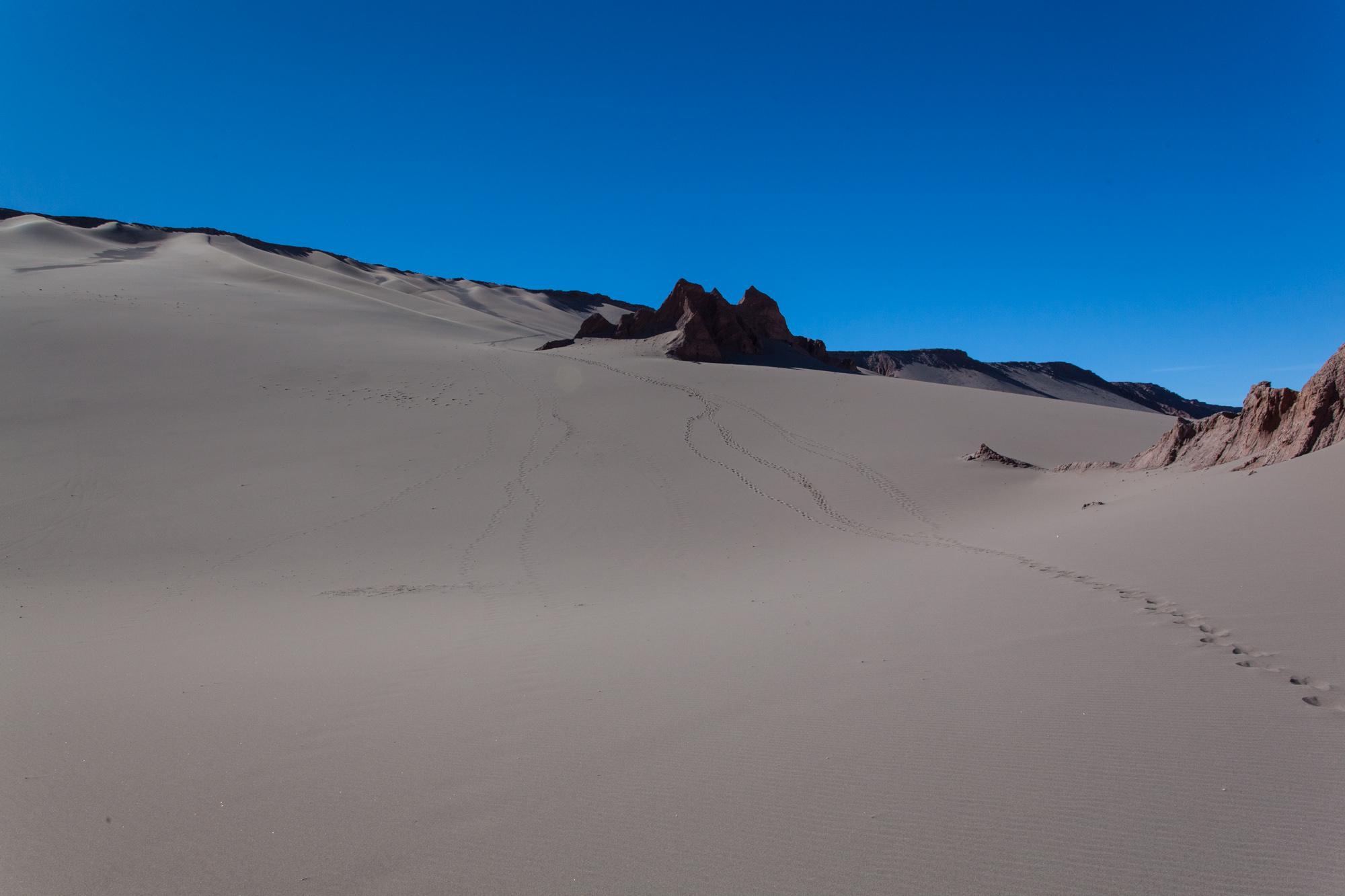 30 kilomètres au départ qui se transformeront en plus de 60 kilomètres avec franchissement d’un col parce que Nicolas n’aura pas vérifié son GPS… La vallée de la Luna, c’est un peu le fond de commerce de toutes les agences de San Pedro de Atacama. Les touristes débarquent en bus par centaines à la même heure (peu avant le coucher du soleil). Peu d’intimité, donc, dans cette vallée qui propose paysages lunaires (effectivement), belles dunes de sable, canyons et circuit dans des grottes.