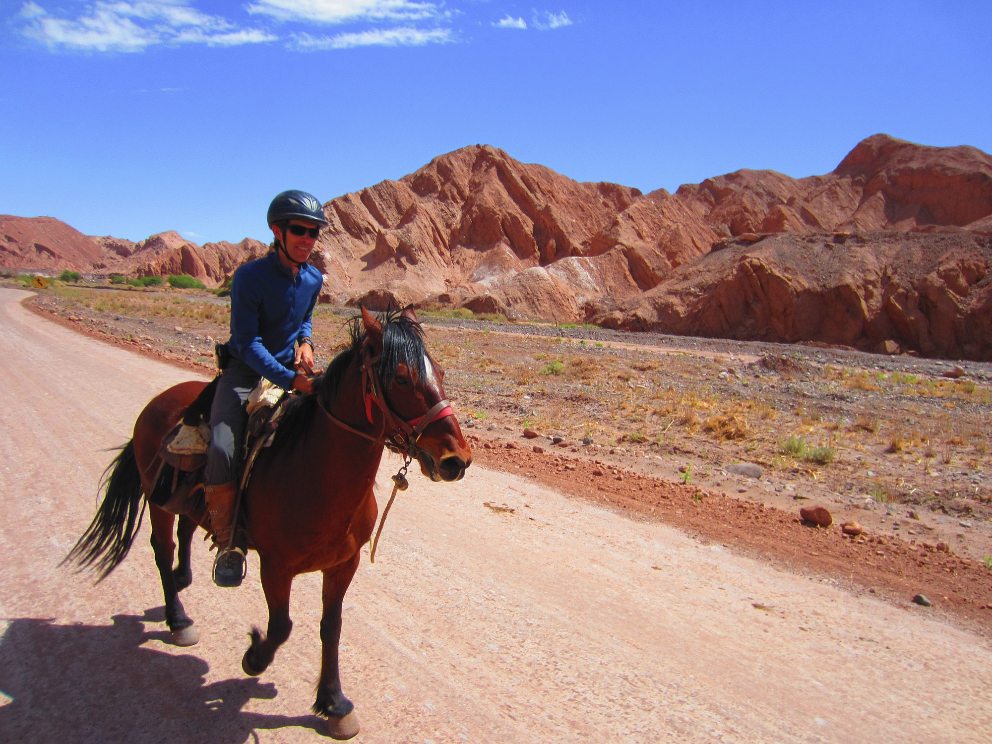 C’est le guide du Routard qui nous en a donné l’idée. Nous négocions avec les tenanciers du Ranch El Cactu une promenade de 5 heures à cheval. Pour Nicolas, c’est le baptême du feu. Il n’a jamais fait d’équitation de sa vie. Après avoir revêtu guêtres et bombes, nous voici partis, Fito, Nicolas, Trago Largo, Granito, Tunero et moi pour la découverte d’une particularité géologique locale: la vallée de la Muerte. Rien à voir avec la Death Valley aux USA. Il s’agit de montagnes rouges sculptées par l’érosion. A l’origine, cette vallée portait le nom de Valle de Martes (Mars), en raison de sa couleur mais un problème de prononciation /compréhension l’a transformé en Vallée de la Mort.