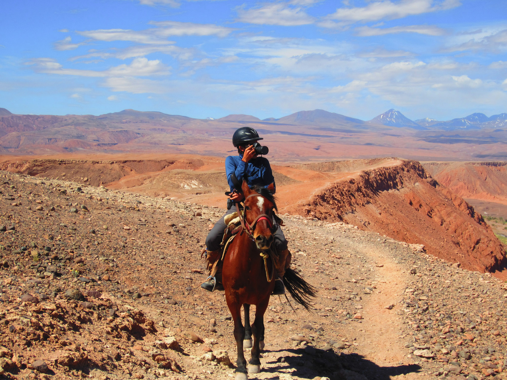 Fito, notre guide, nous conseille de forcer nos chevaux à le suivre de près car la pente est forte et les chevaux, impressionnés, hésitent parfois à s’engager sur le sable. Nos encouragements portent leurs fruits. Granito et Tunero entament la descente vertigineuse. Nicolas a parfois du mal à contenir l’enthousiasme de Tunero qui piquerait bien un triple galop en descente, quitte à faire un joli “cul par-dessus tête”. Le dessin des dunes est vraiment magnifique. Le soleil baissant, les couleurs des roches se ravivent. Entre deux trots, Nicolas fait le plein d’images.