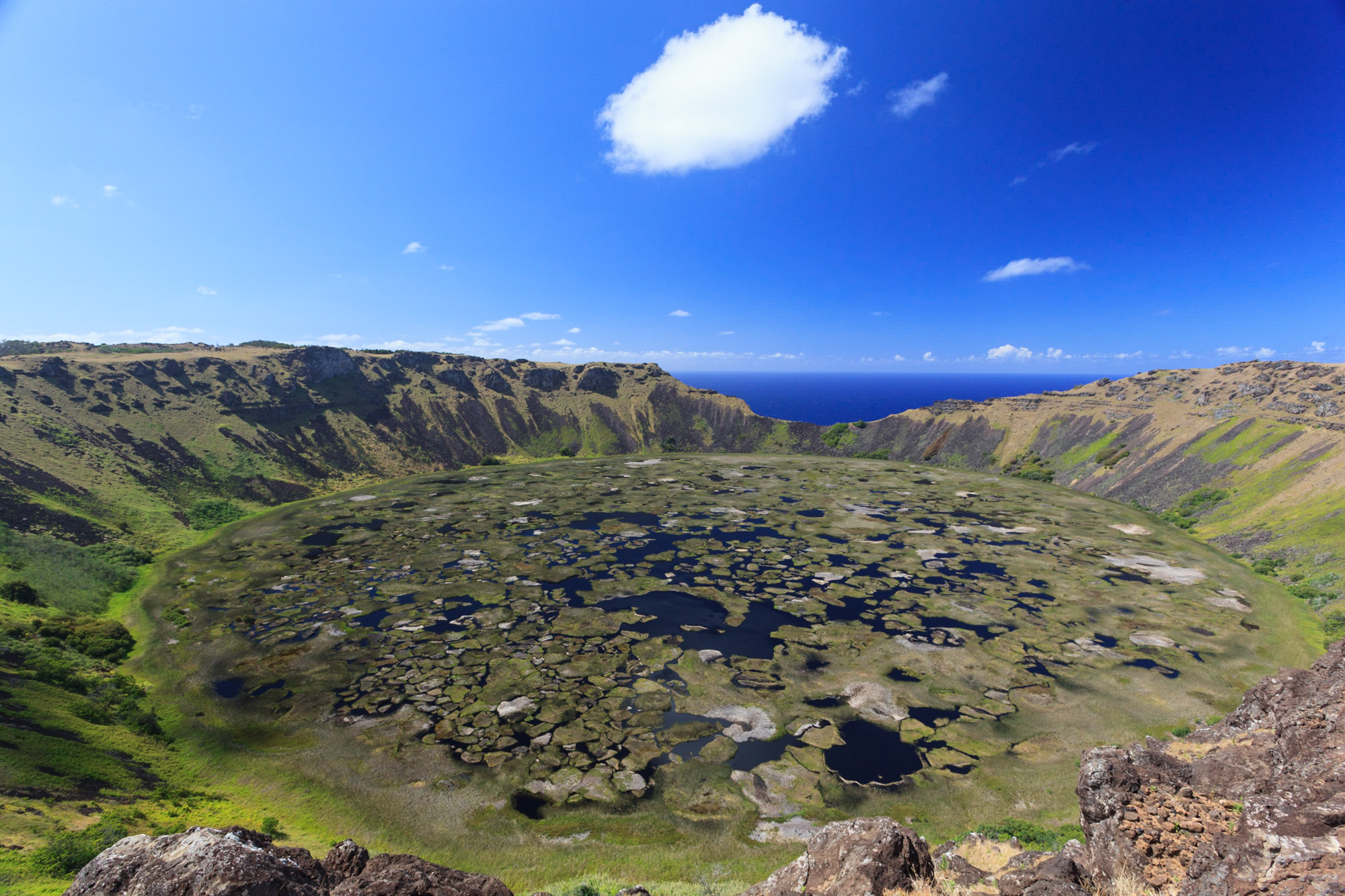 Le cratère du volcan Rano Kao renferme un véritable écosystème. Un lac d'eau douce qui servait anciennement à l'approvisionnement d'Hanga Roa. Au milieu du lac poussent des joncs de totora. Les mêmes que ceux du lac Titicaca. Un indice qui avait fait penser à Thor Heyerdahl (celui du Kon Tiki, voir art. Pérou) que la population de Pâques était d'origine péruvienne. Le cratère descend en pente abrupte vers le lac. Côté mer, une brèche nette indique la direction d'écoulement de la lave lorsque le volcan était en activité, il y a 2,5 millions d'années.