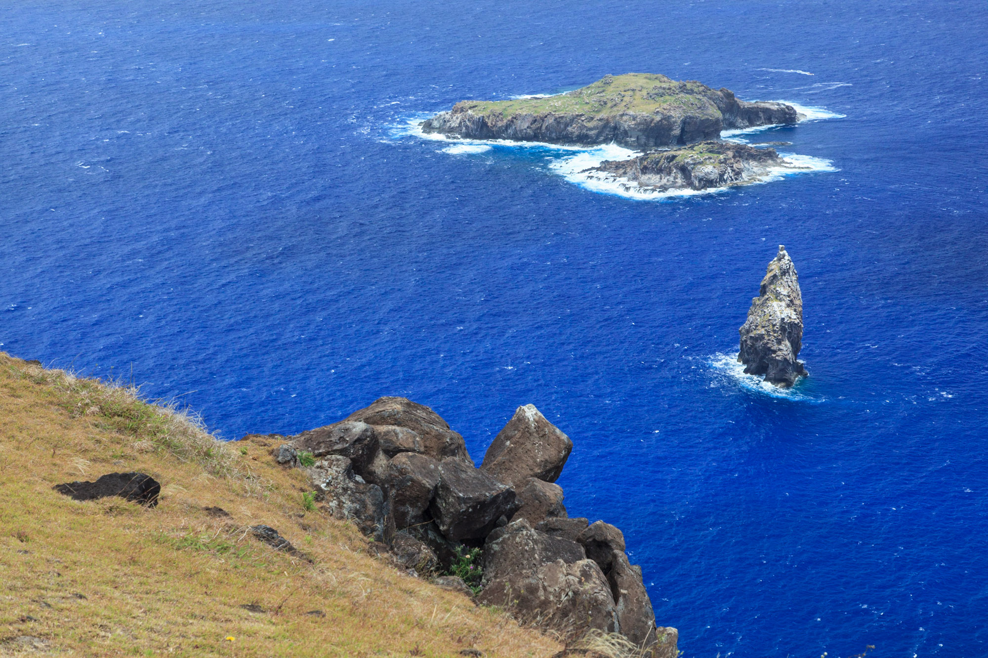 Nous faisons le tour du cratère pour aller chercher le point de vue sur l'océan et les îlots (Motu) Nui, Iti et Kao Kao. Des oiseaux survolent les îlots: des sternes. A l'époque du culte de l'Homme-Oiseau, ce sont sur ces îles que les champions désignés par leurs tribus devaient aller chercher le premier oeuf de la saison de ponte. Dans une course périlleuse partant du village d'Orongo, ils descendaient la falaise escarpée de près de 300m et rejoignaient les îlots à la nage. Entre ceux qui tombaient du haut de la falaise lors de la descente, ceux qui étaient emportés par les courants marins et ceux qui se faisaient dévorer par les requins, les victimes étaient nombreuses.