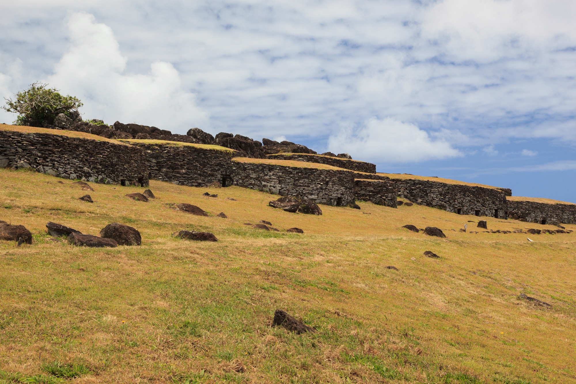 Nous passons devant des habitations souterraines autrefois utilisées par les autochtones. De l'extérieur, les habitations sont quasiment invisibles: des monticules de pierres couverts par les herbes pascuanes. Un moyen de rester cachés car les attaques étaient nombreuses entre tribus. En témoigne le pauvre Moais renversé que nous croisons plus loin. Sur le chemin, on passe aussi devant une caverne dans laquelle ont été gravés des pétroglyphes représentant le dieu Créateur Make-Make, lié au culte de l'Homme-Oiseau.
