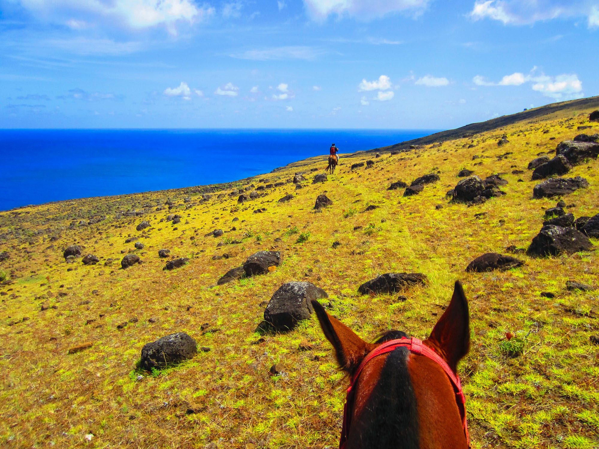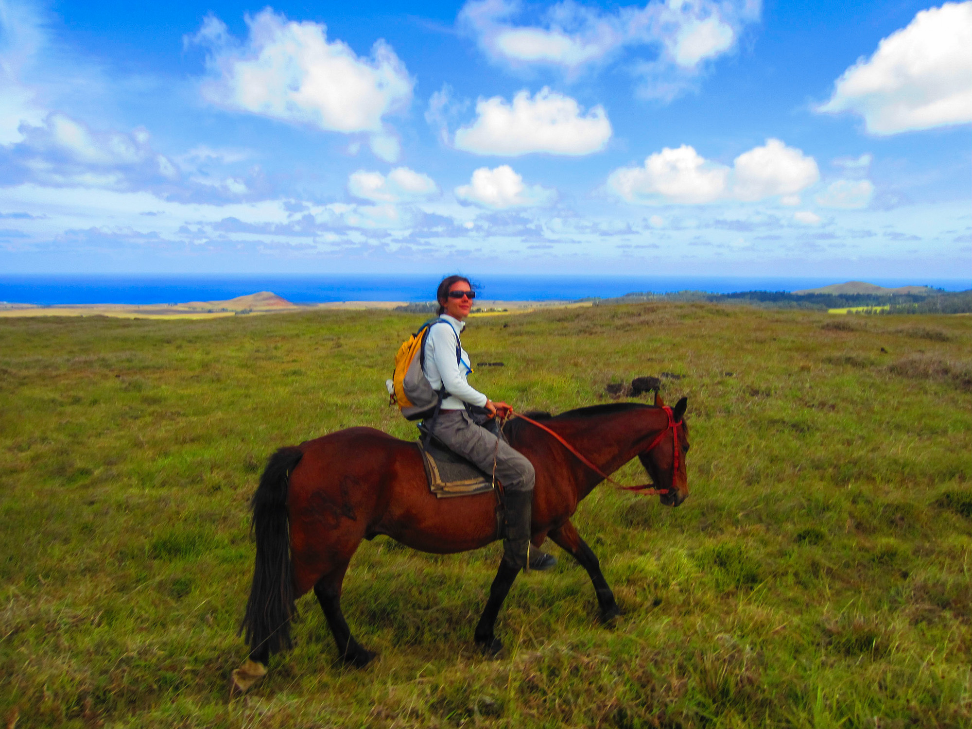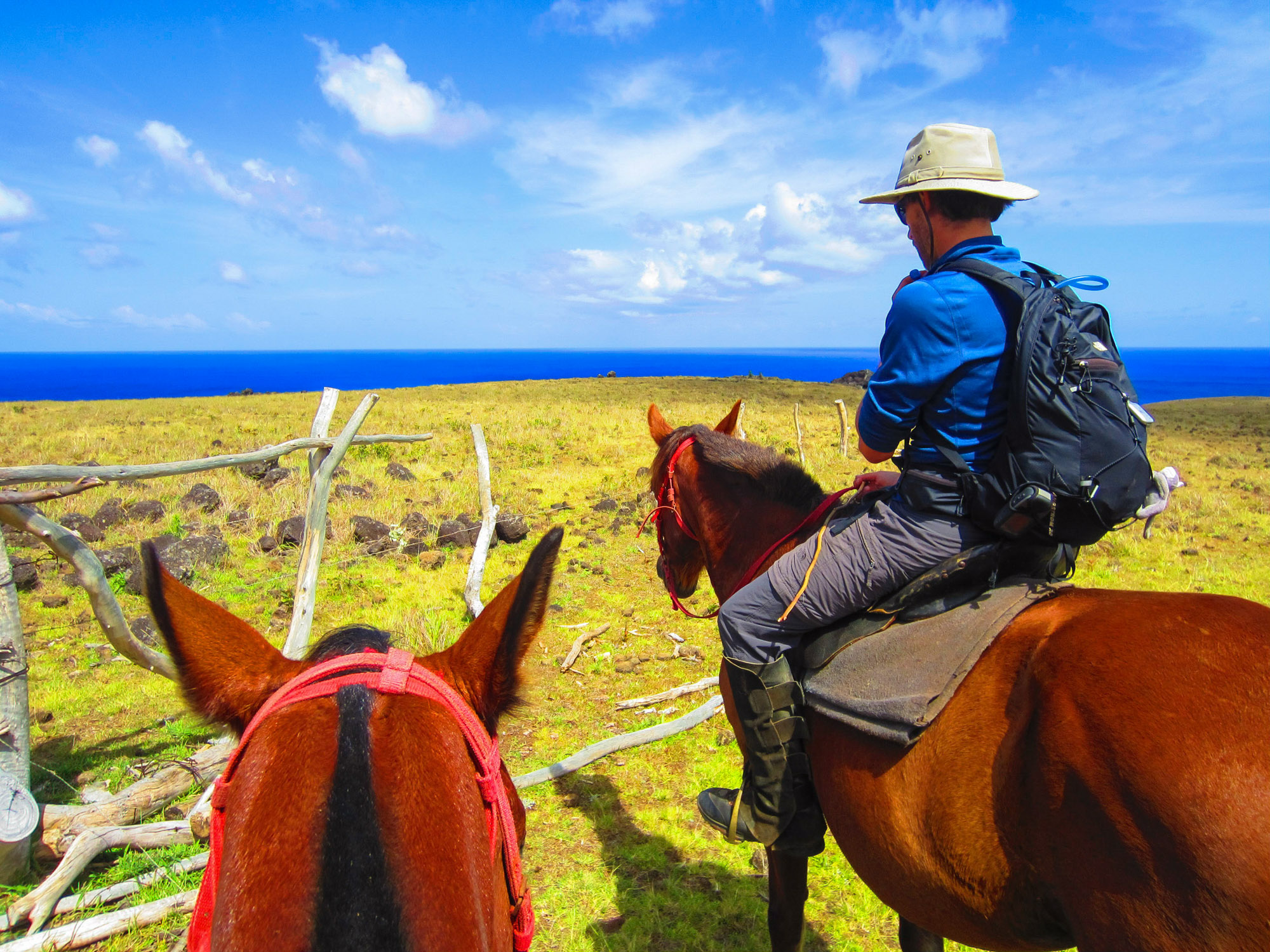 Nous partons dans les champs du bord de mer au trot. Peu après la sortie de la ville, nous rejoignons par des pistes un des endroits les moins fréquentés de l'île. Nous accédons à des terres surplombant l'océan. Les collines sont recouvertes d'herbes jaunes et de scories noires issues des éruptions volcaniques qui donnèrent naissance à l'île. Nos chevaux doivent se frayer un chemin entre les pierres. L'océan Pacifique qui s'étend à l'infini présente un bleu intense magnifique. Aucune terre vivable avant 3760 km... On se sent seuls et on ne peut s'empêcher de penser au plan d'évacuation de l'île en cas de tsunami, d'incendie géant ou d'épidémie...