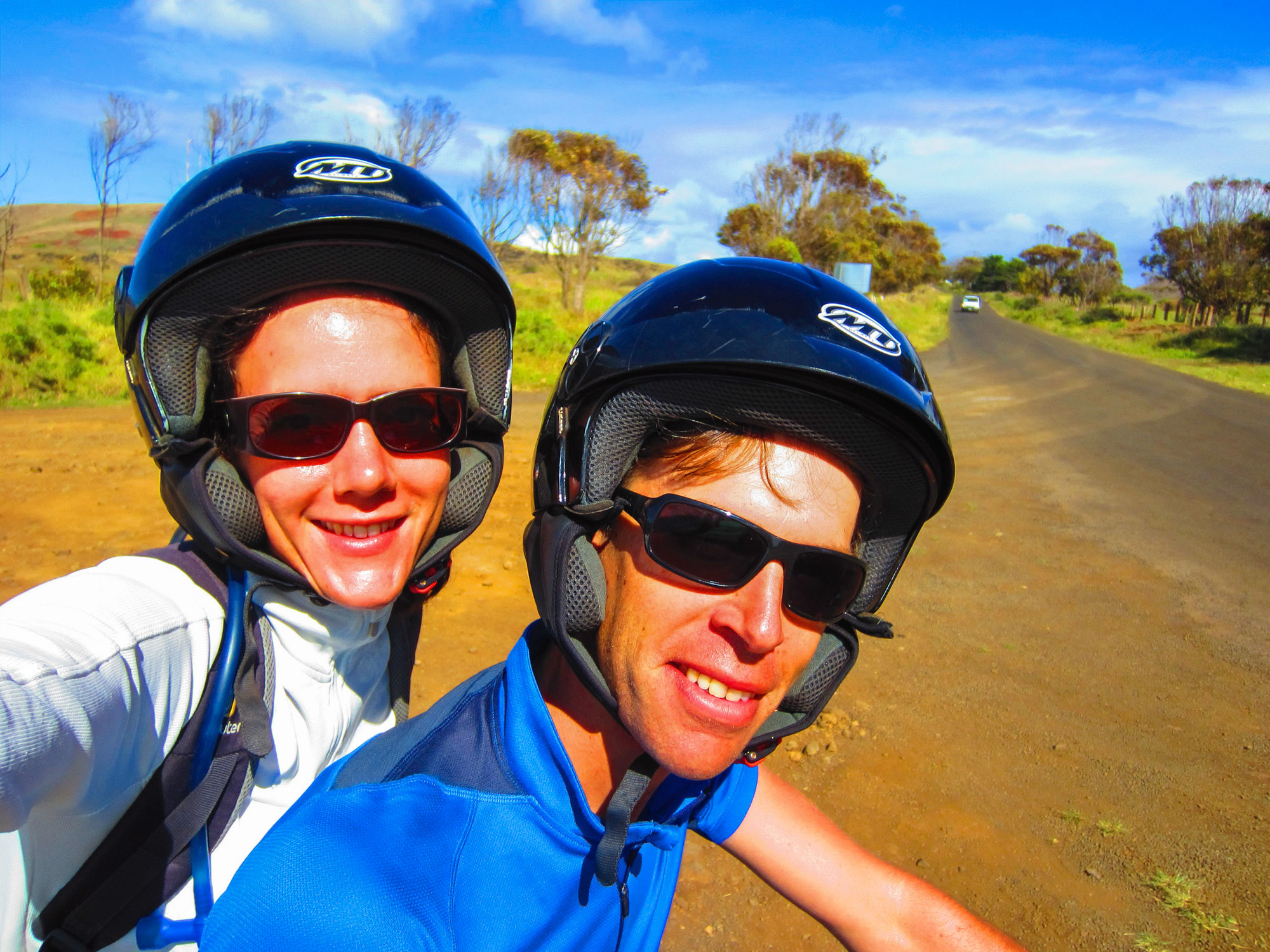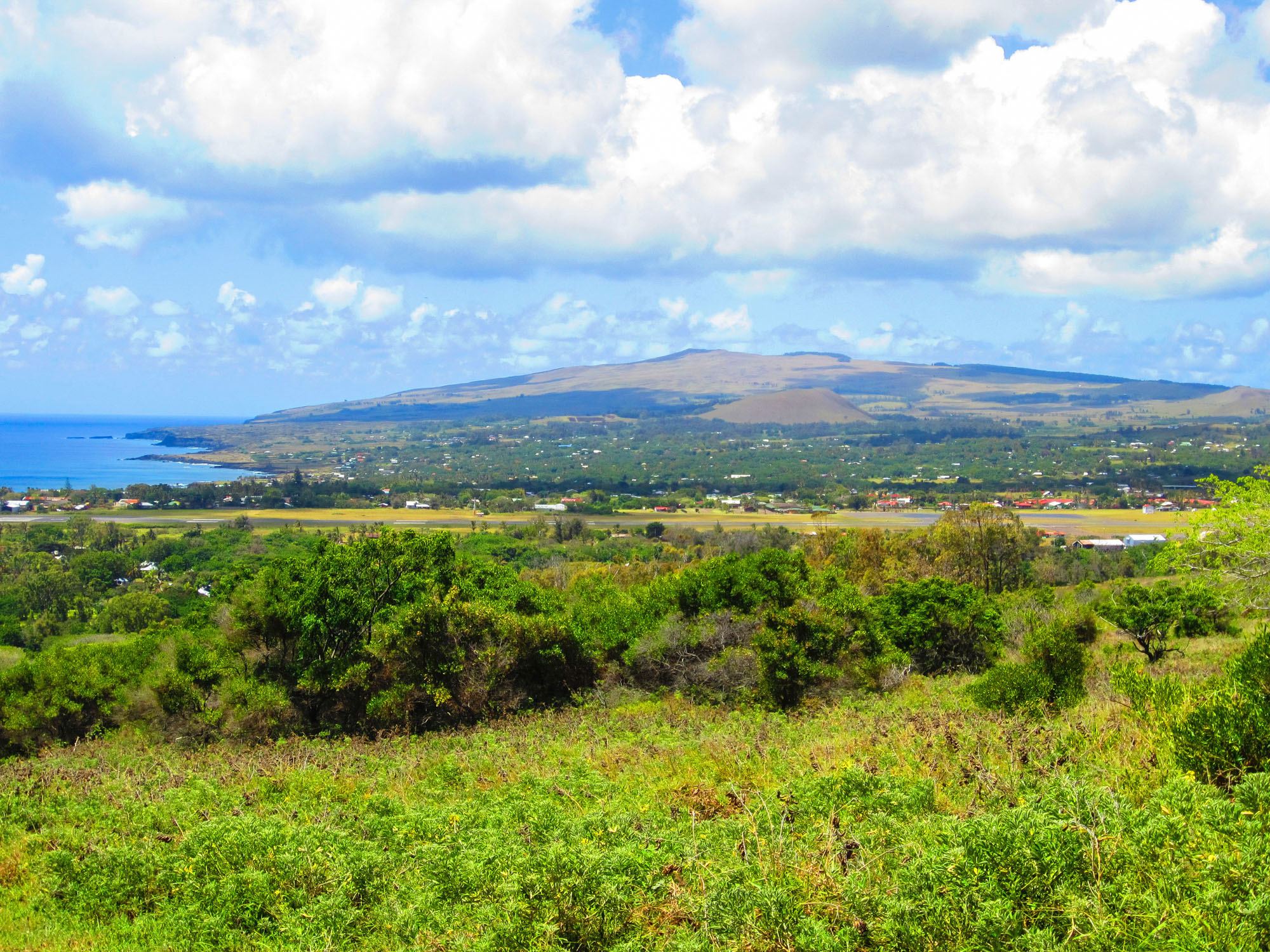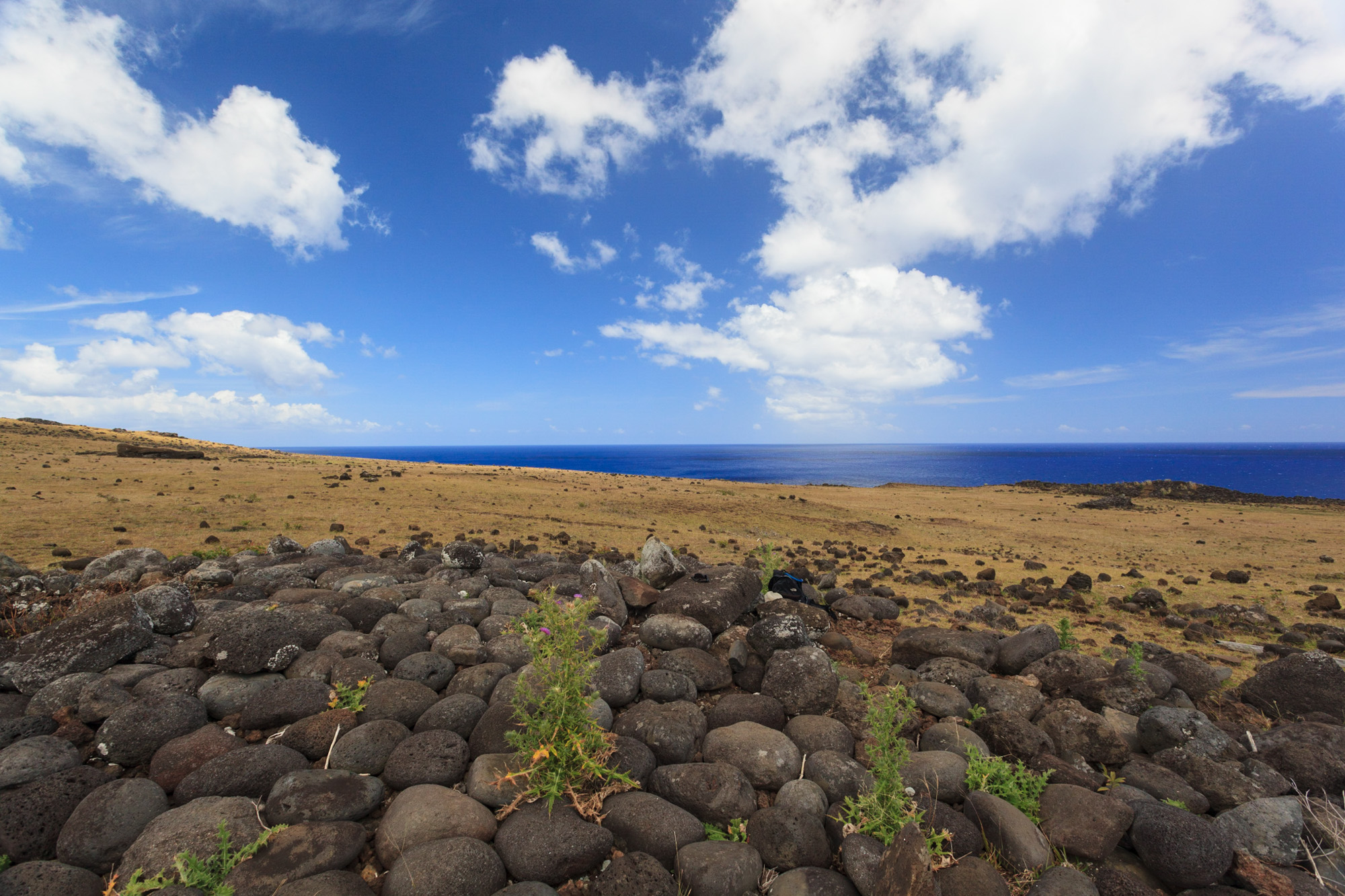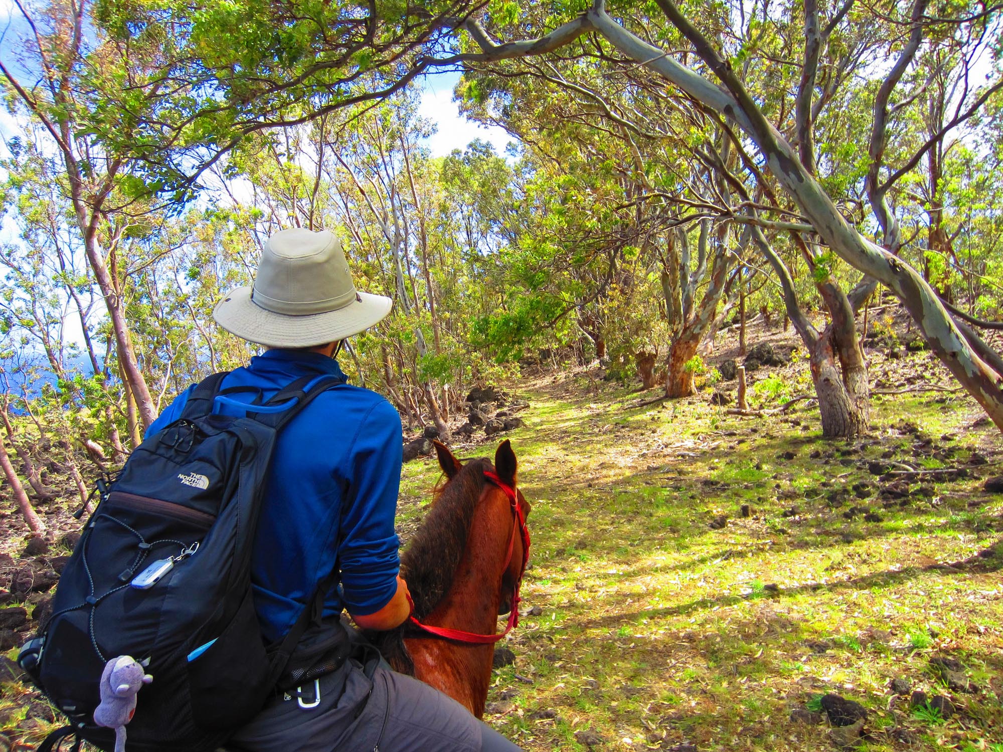 Nous partons dans les champs du bord de mer au trot. Peu après la sortie de la ville, nous rejoignons par des pistes un des endroits les moins fréquentés de l'île. Nous accédons à des terres surplombant l'océan. Les collines sont recouvertes d'herbes jaunes et de scories noires issues des éruptions volcaniques qui donnèrent naissance à l'île. Nos chevaux doivent se frayer un chemin entre les pierres. L'océan Pacifique qui s'étend à l'infini présente un bleu intense magnifique. Aucune terre vivable avant 3760 km... On se sent seuls et on ne peut s'empêcher de penser au plan d'évacuation de l'île en cas de tsunami, d'incendie géant ou d'épidémie...